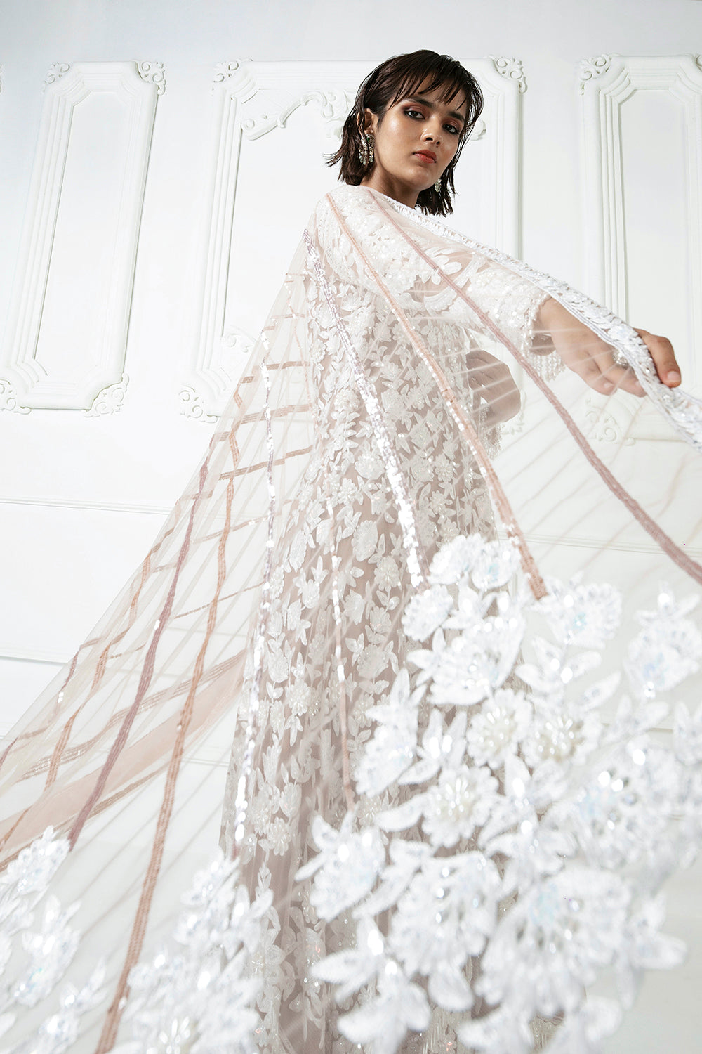 Beige net Kashmiri anarkali with sequins highlights. Paired with beige pants & dupatta.