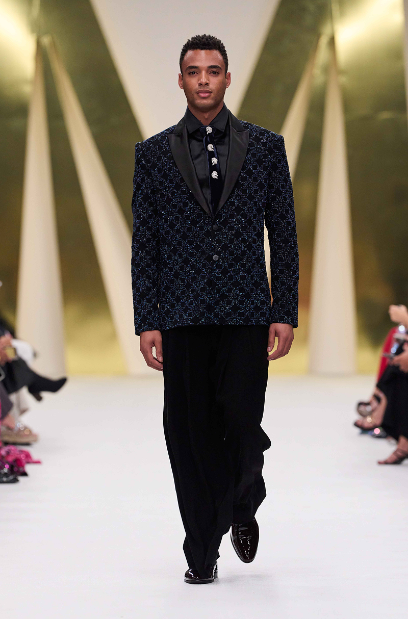 Black & blue handcrafted with small beads lapel blazer paired with shirt and pant.
