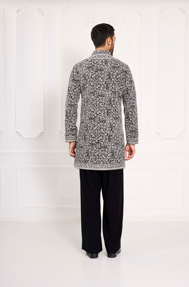 Black with silver dori thread all over embroidered kurta, paired with flared pants.