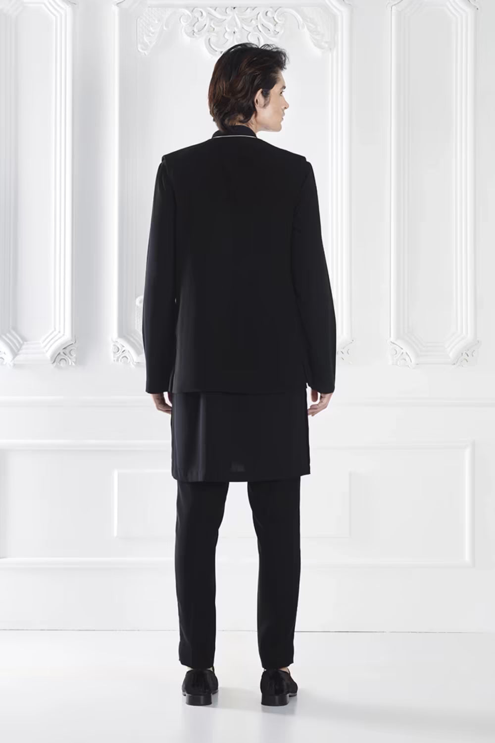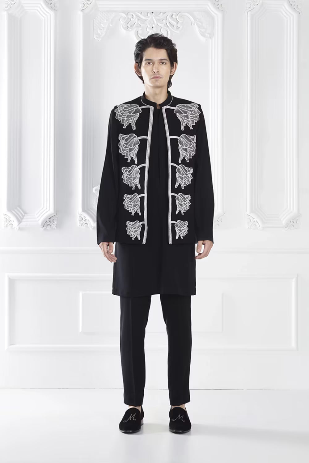 Black bandi, adorned with refined floral embroidery. Matched with a kurta and aligarhi - an ideal selection for a groom's cocktail party.