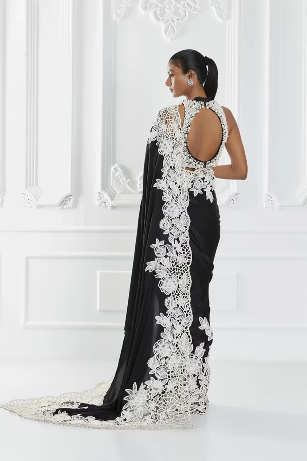 Black satin saree with ivory floral embroidery. Paired with a pearl embellished blouse & stitched inskirt.