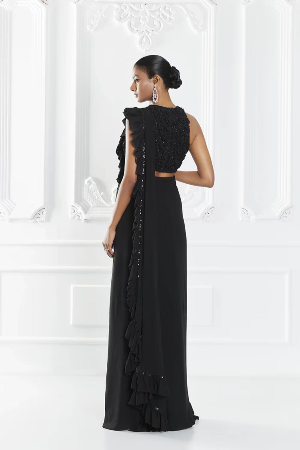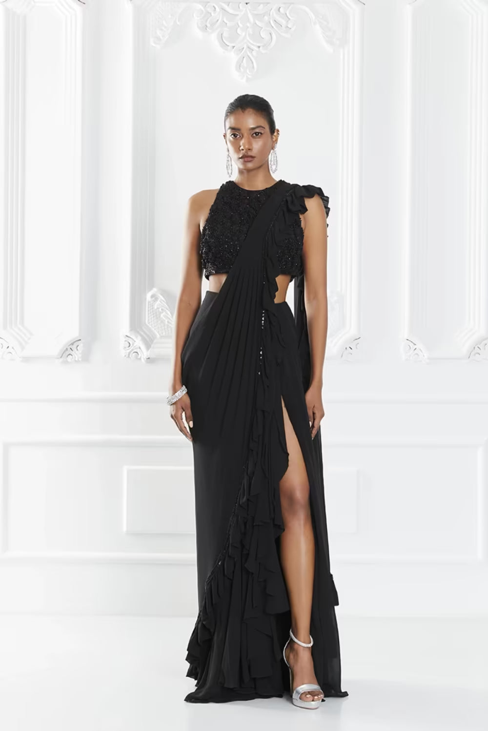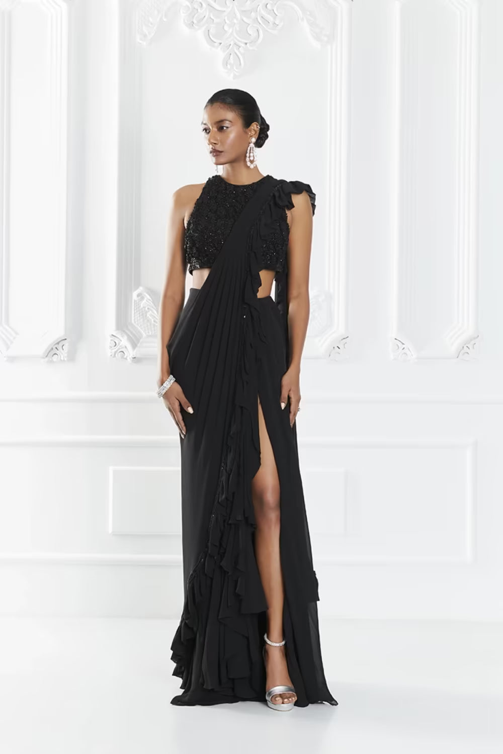 Black georgette stitched saree highlighted with ruffle detailing and high slit. Paired with a 3D floral embroidered blouse.