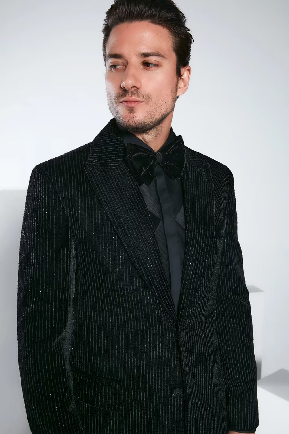 Black velvet pinstriped blazer. Paired with matching shirt & plain trousers.