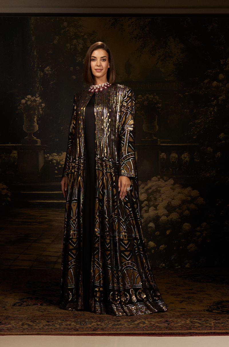 Introducing a black georgette jacket, beautifully embellished with intricate rainbow sequin work. It is paired with a matching slip for a coordinated and elegant look.