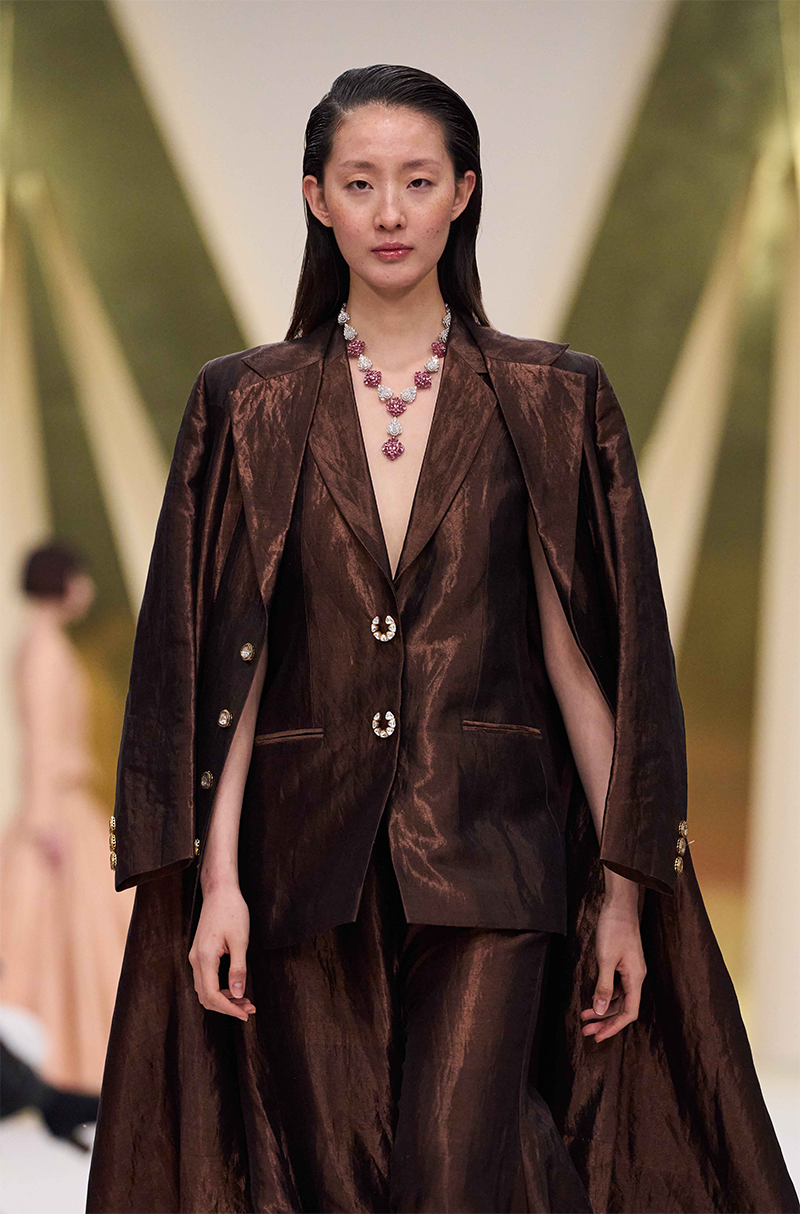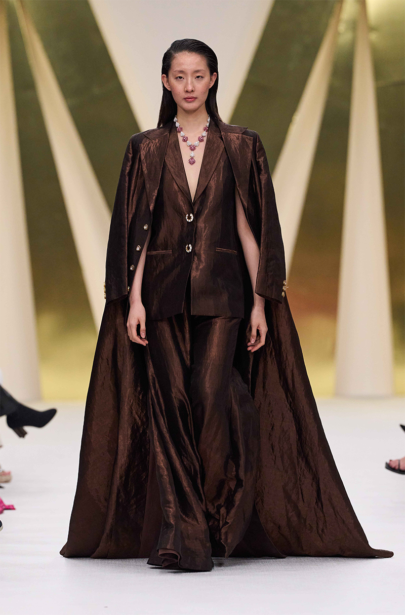 Brown tissue waist coat embellished with stone buttons and wide leg pant.