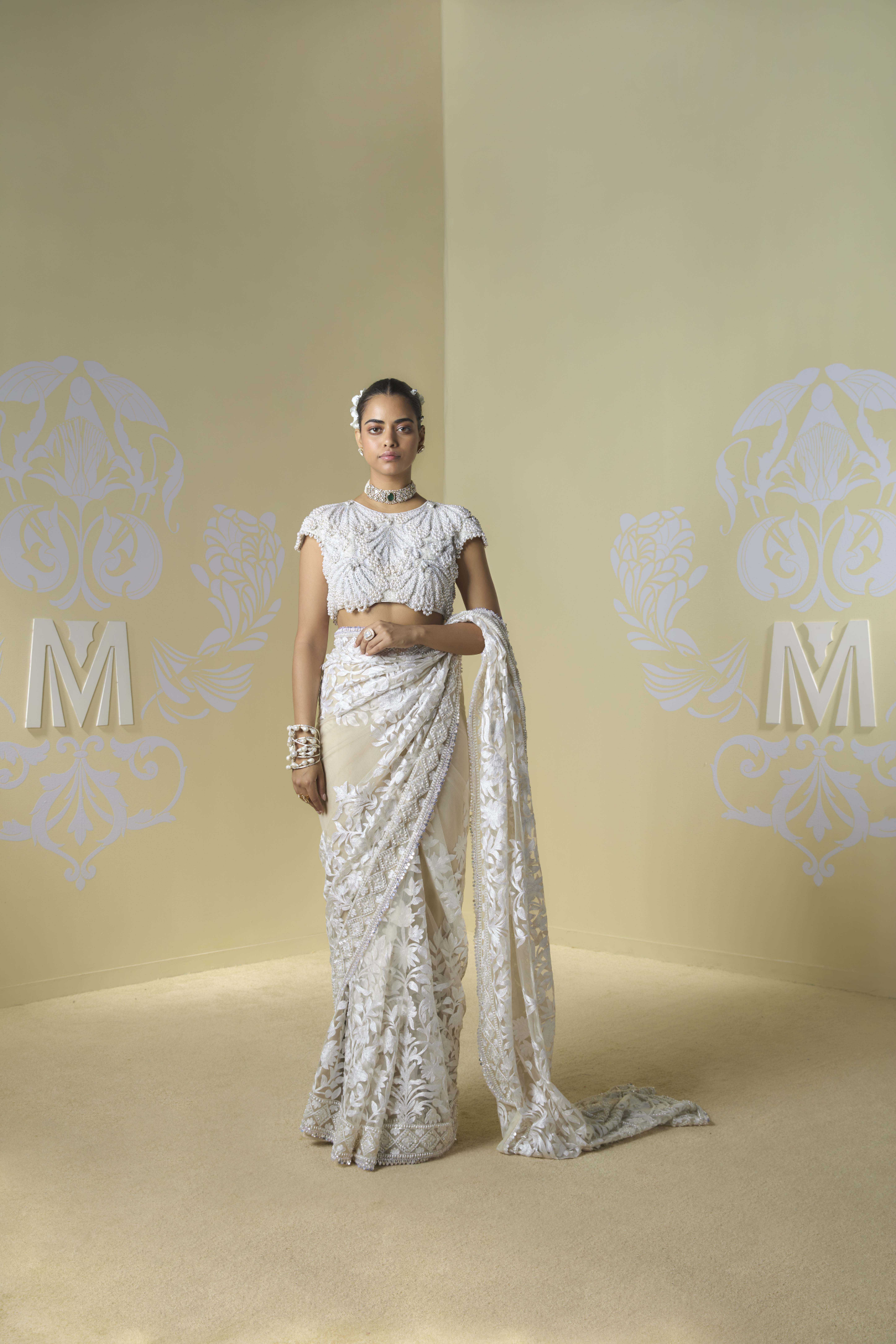 Cream net kashmiri embroidered saree. Paired with a pearl encrusted blouse and inskirt.