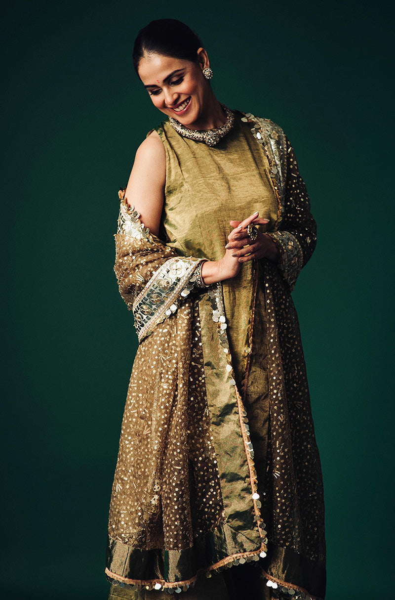 Genelia Deshmukh in our olive green tissue kurta & pallazo adorned with handcraft border. Paired with an matching sequin embroidered dupatta.