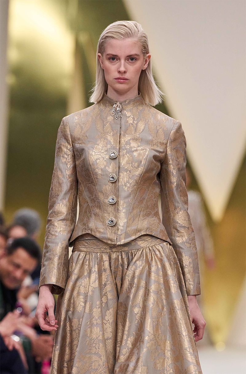 Grey brocade corset jacket adorned with stone buttons paired with a matching brocade skirt.