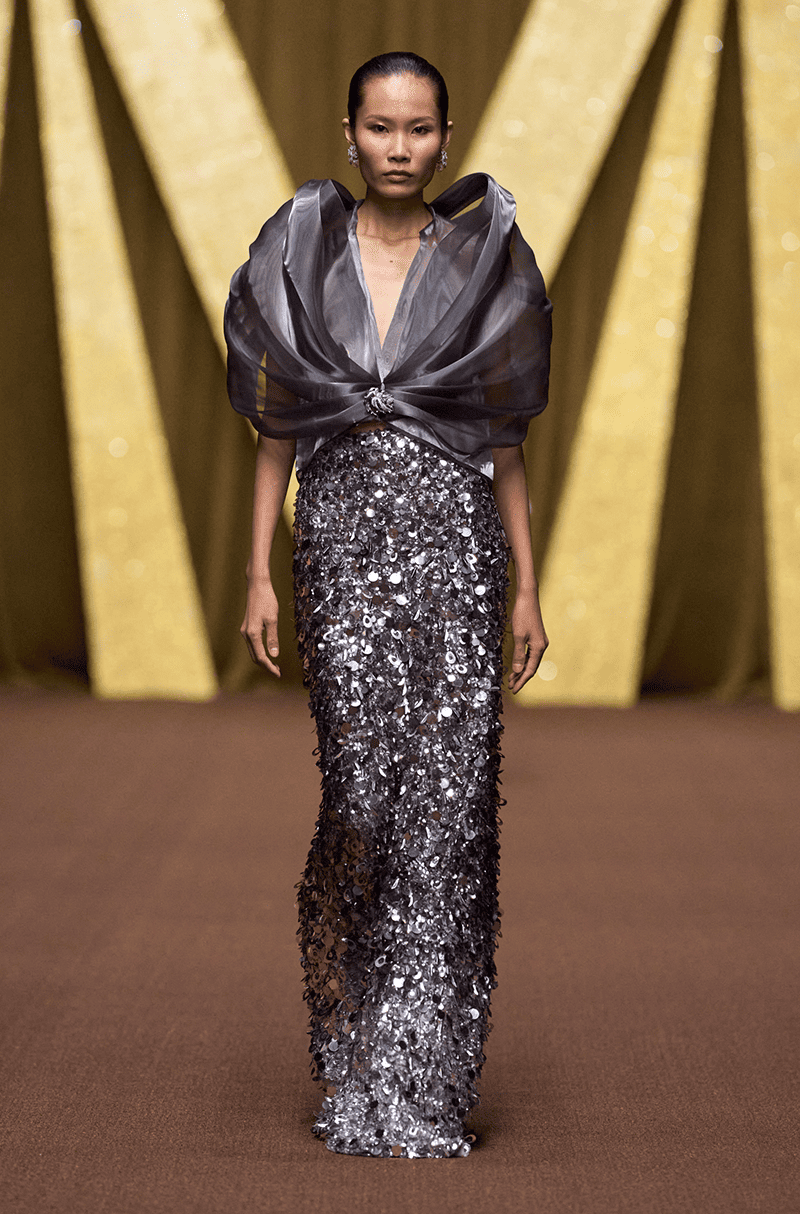 Gun metal - silver multi-ring sequin slim skirt. Paired with a matching- coloured structured bow top.