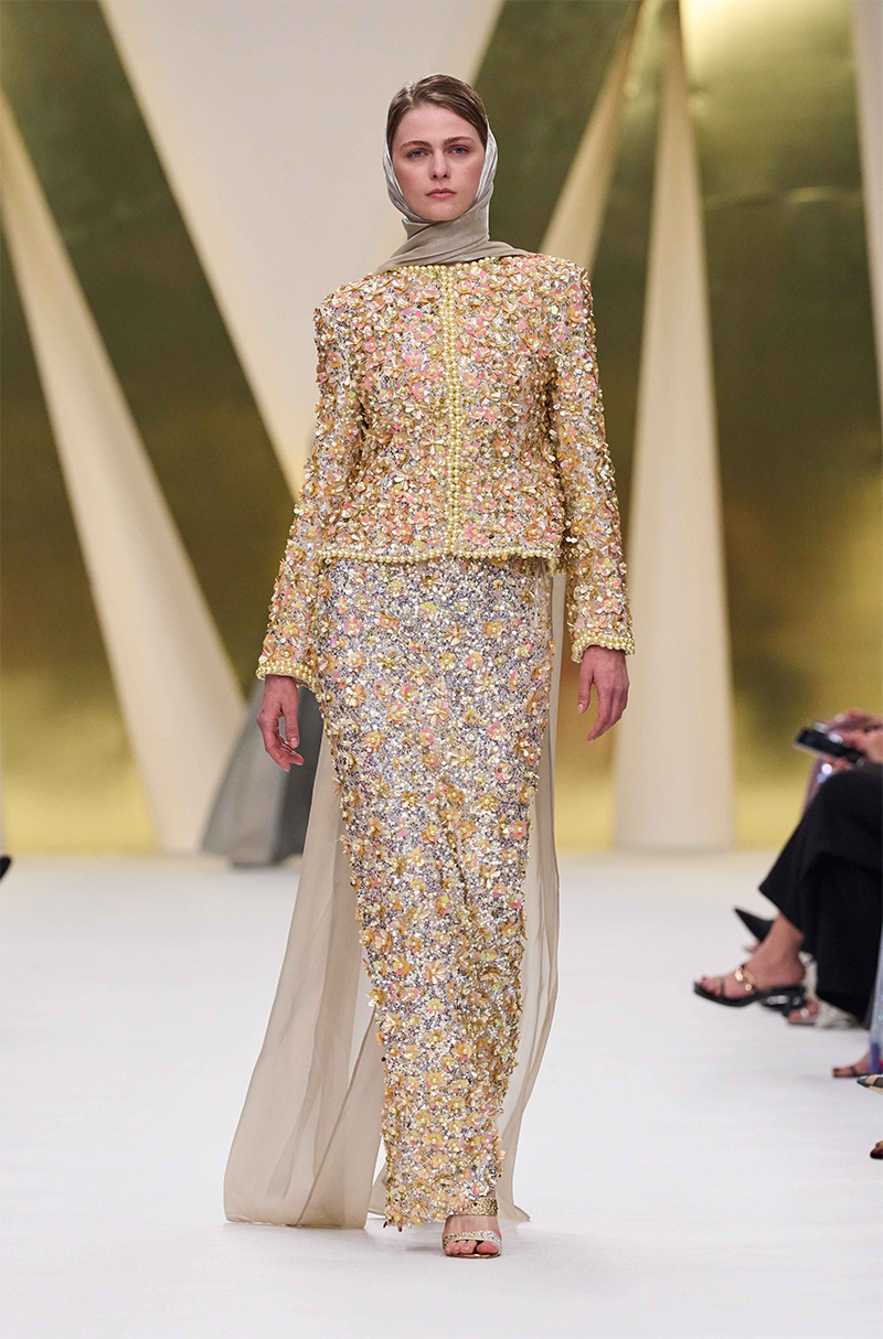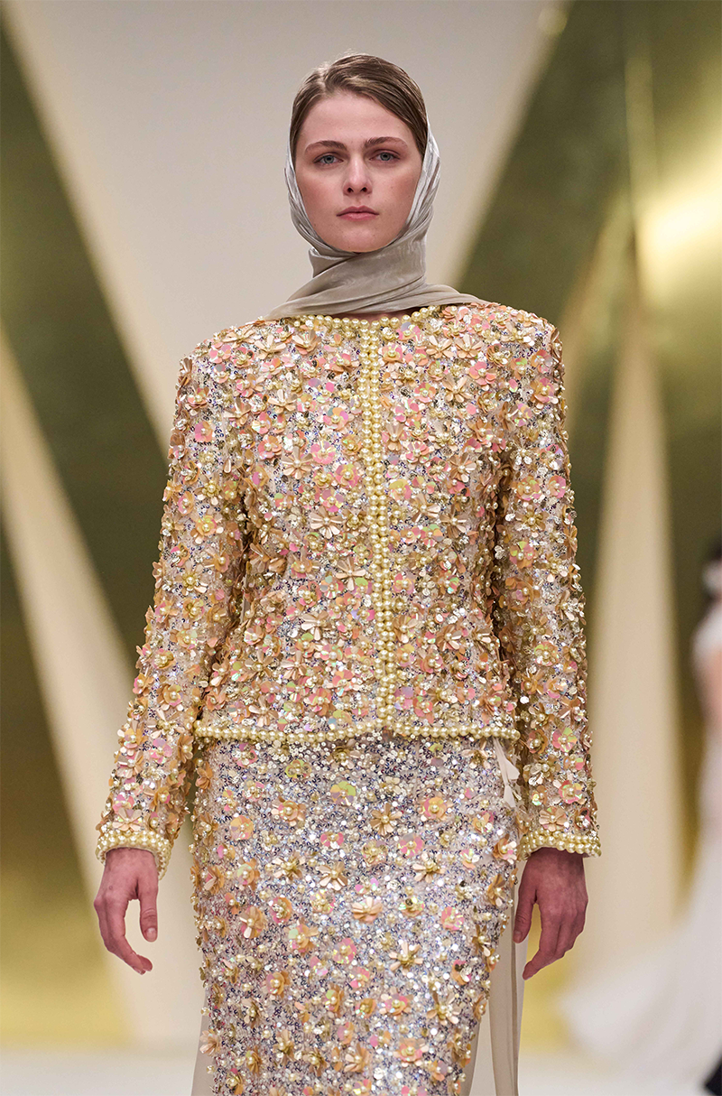 Ivory 3D floral embroidered jacket paired with a matching embroidered straight skirt.