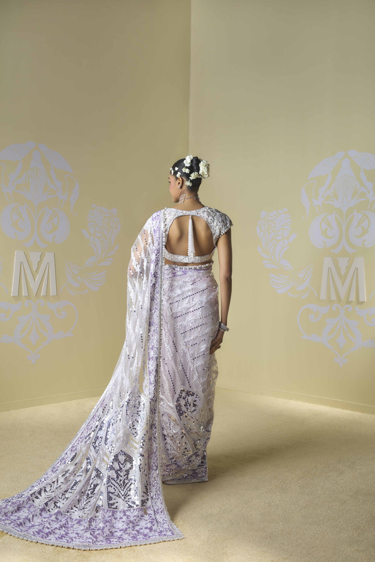 Ivory kashmiri saree highlighted with lavender diamond sequins. Paired with a matching blouse and inskirt. ​