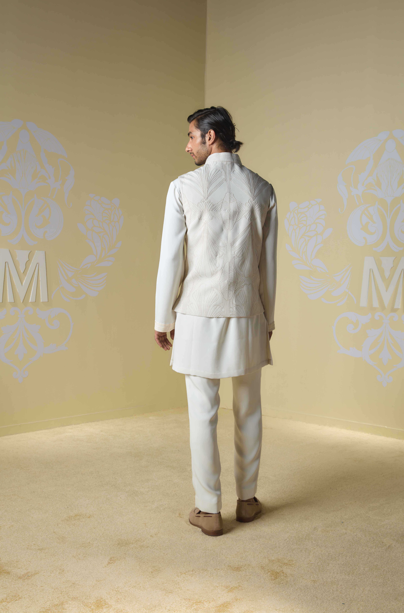 Elevate your style with this Ivory Embroidered Bandi, perfectly paired with a coordinating kurta and pant. Ideal for festive occasions, this ensemble combines traditional craftsmanship with modern sophistication.