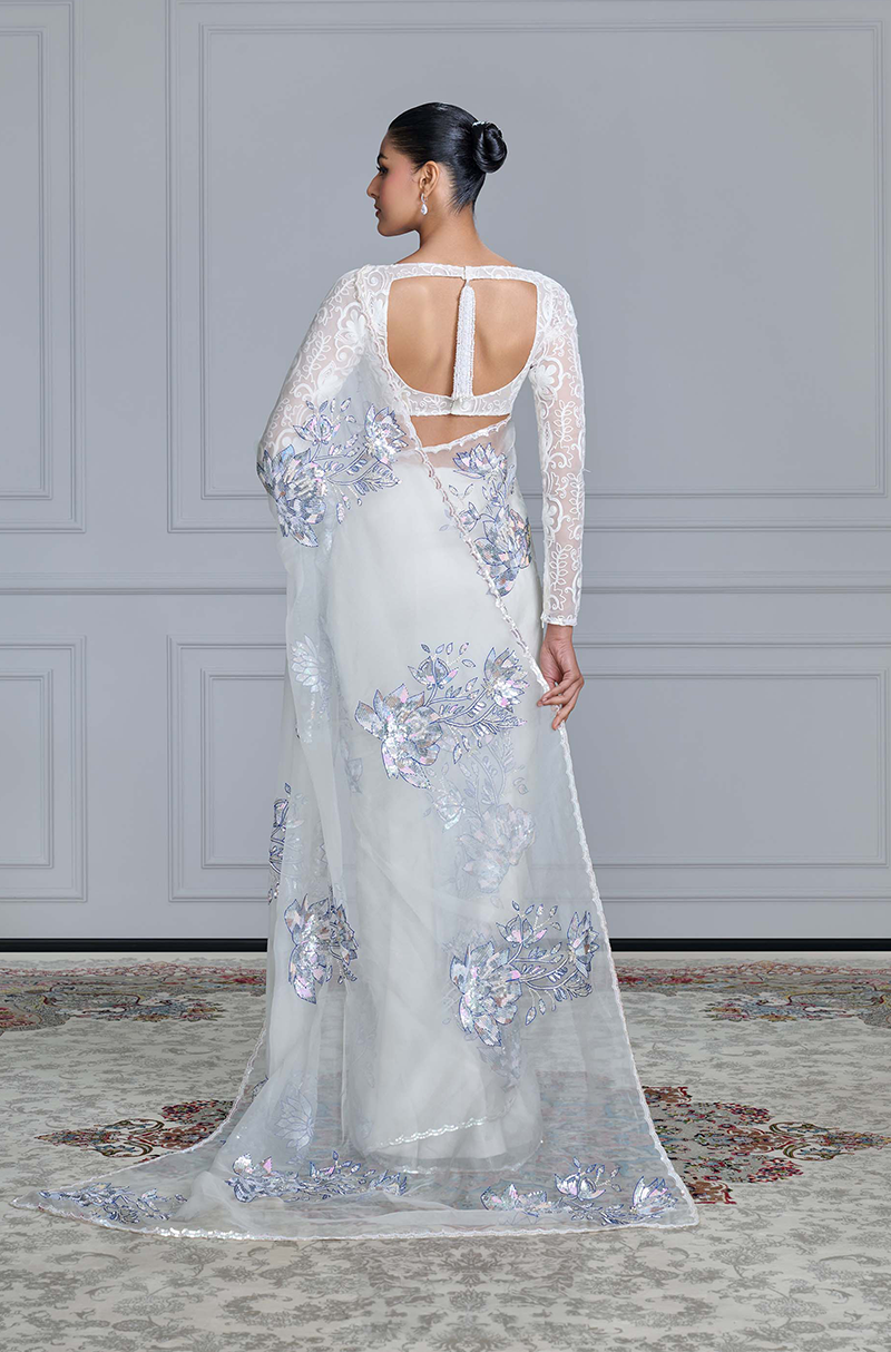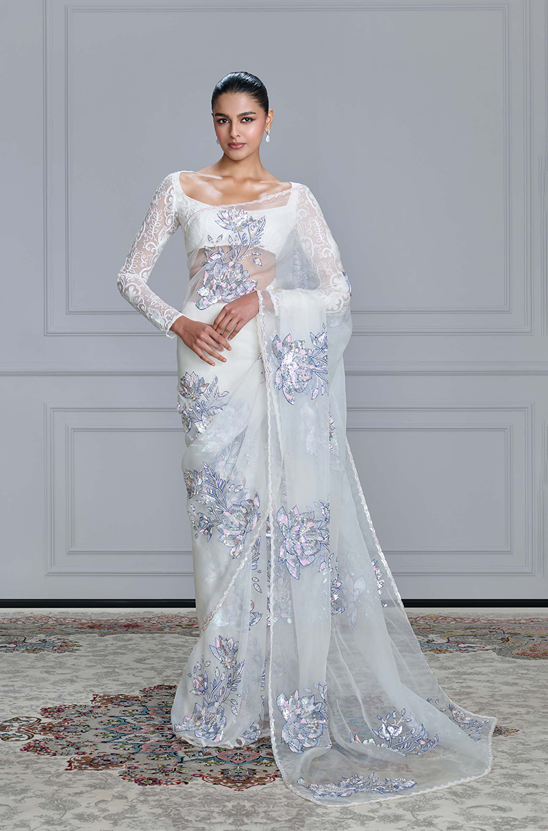 Ivory floral sequin saree. Paired with matching thread work blouse & inskirt.