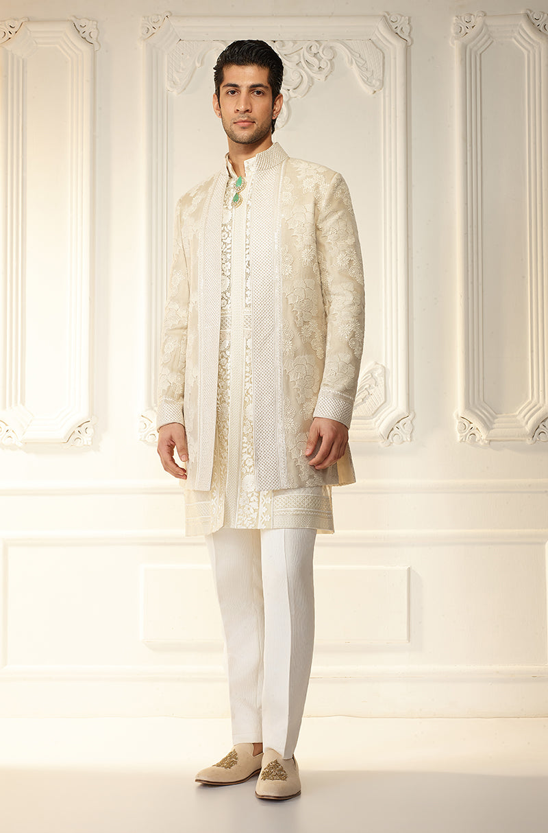 Ivory floral threadwork sherwani. Paired with plain kurta & trousers.