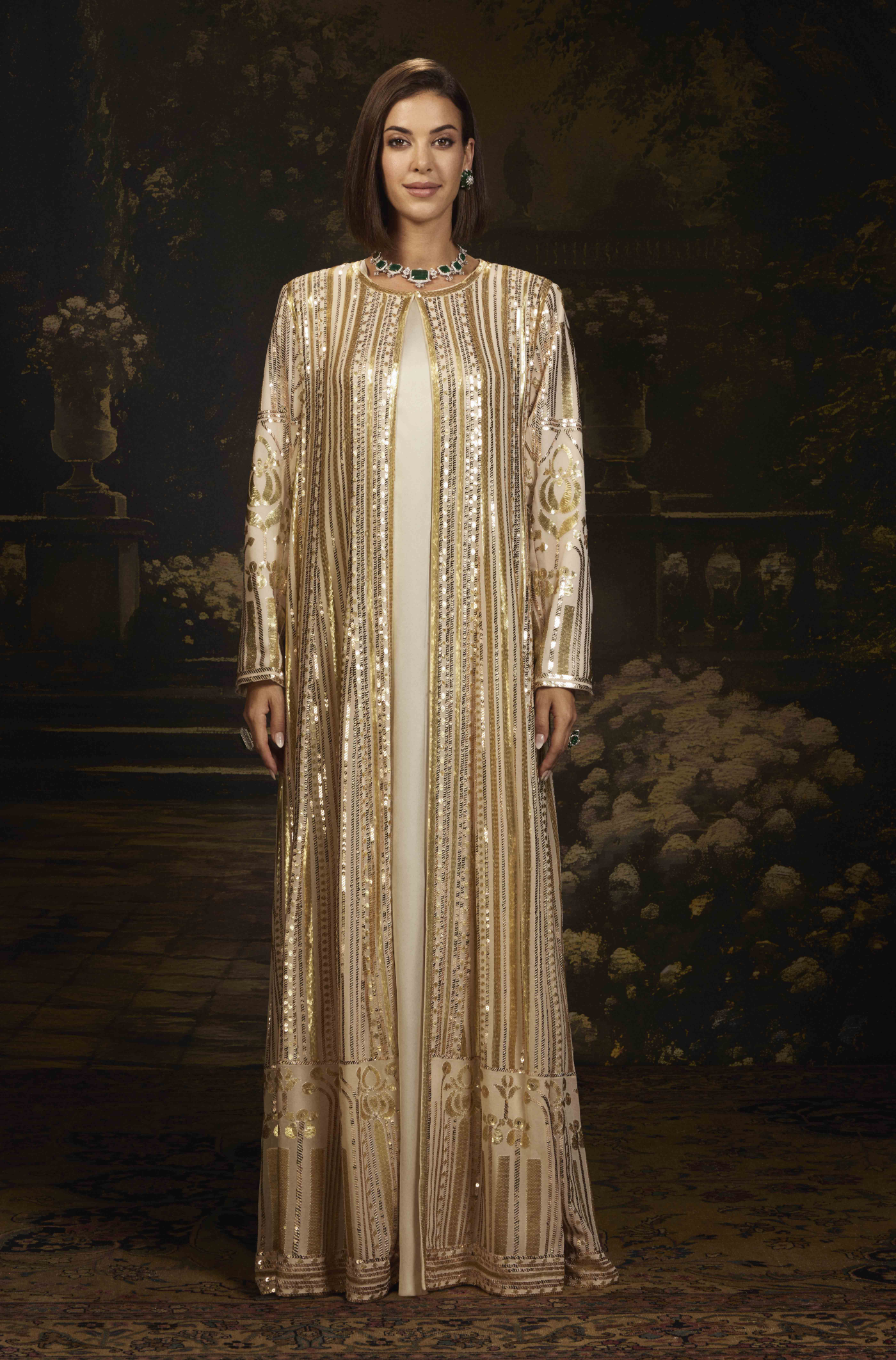 Introducing an ivory georgette jacket, beautifully embellished with intricate gold sequin work. It is paired with a matching slip for a coordinated and elegant look.
