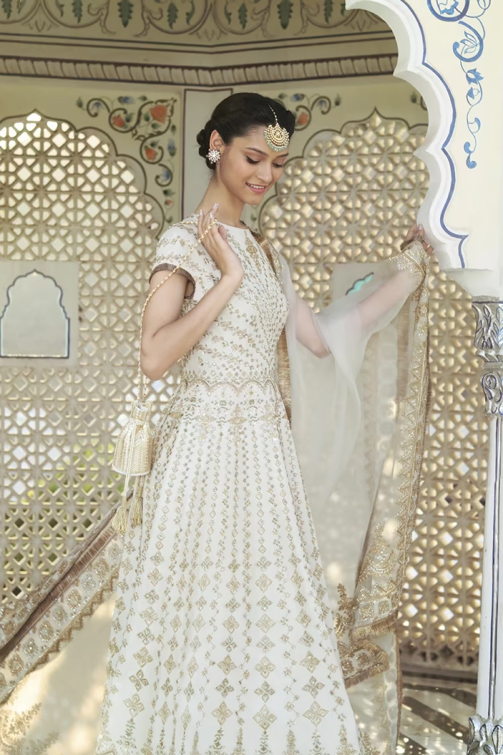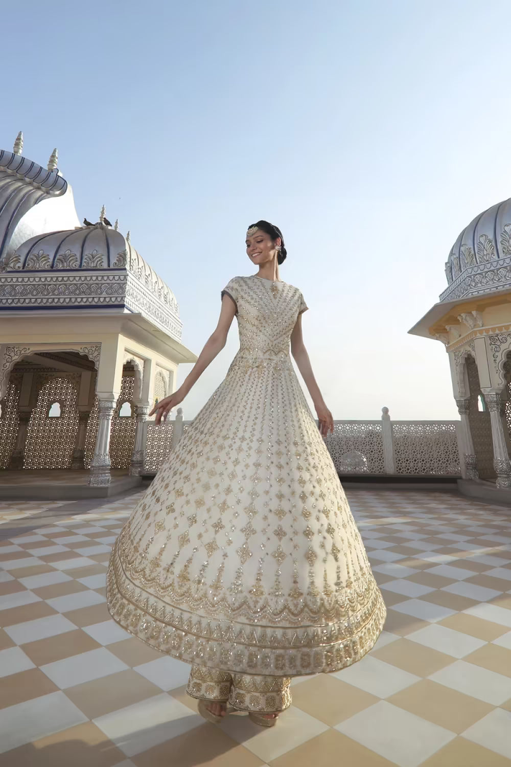 Ivory silk kalidar embroidered in zari and sequins. Paired with a tonal pallazo and an ivory duppatta.