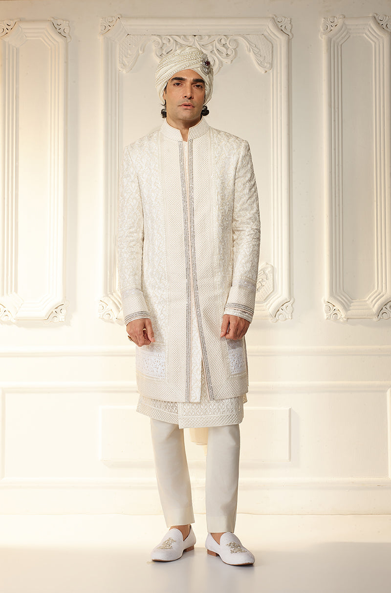 Ivory Kashmiri embroidered sherwani highlighted with stone border. Paired with a matching plain kurta & trouser.