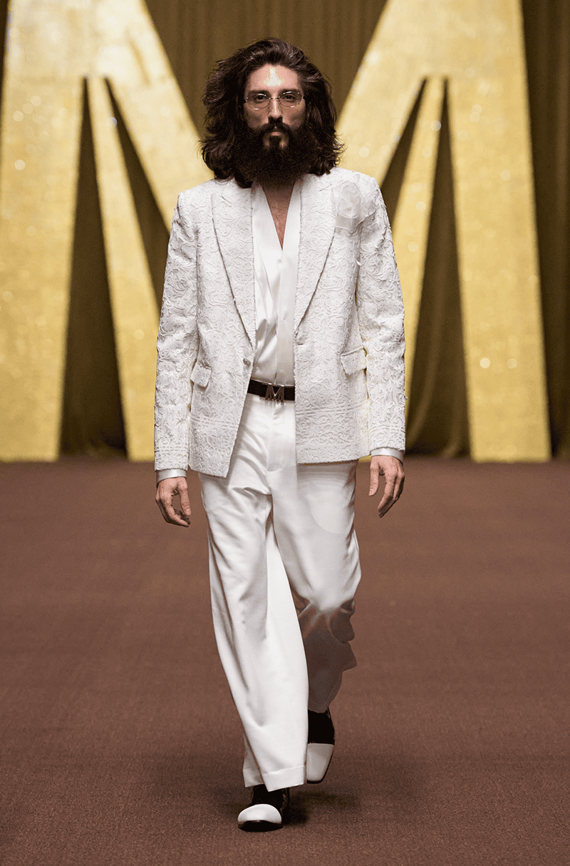 Ivory lazer cut blazer paired with a plain shirt & trouser.