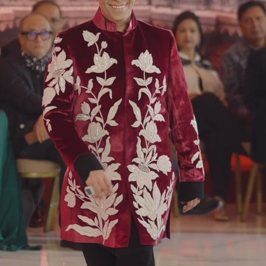 Maroon velvet sherwani highlighted with ivory floral dori embroidery. Paired with trousers.