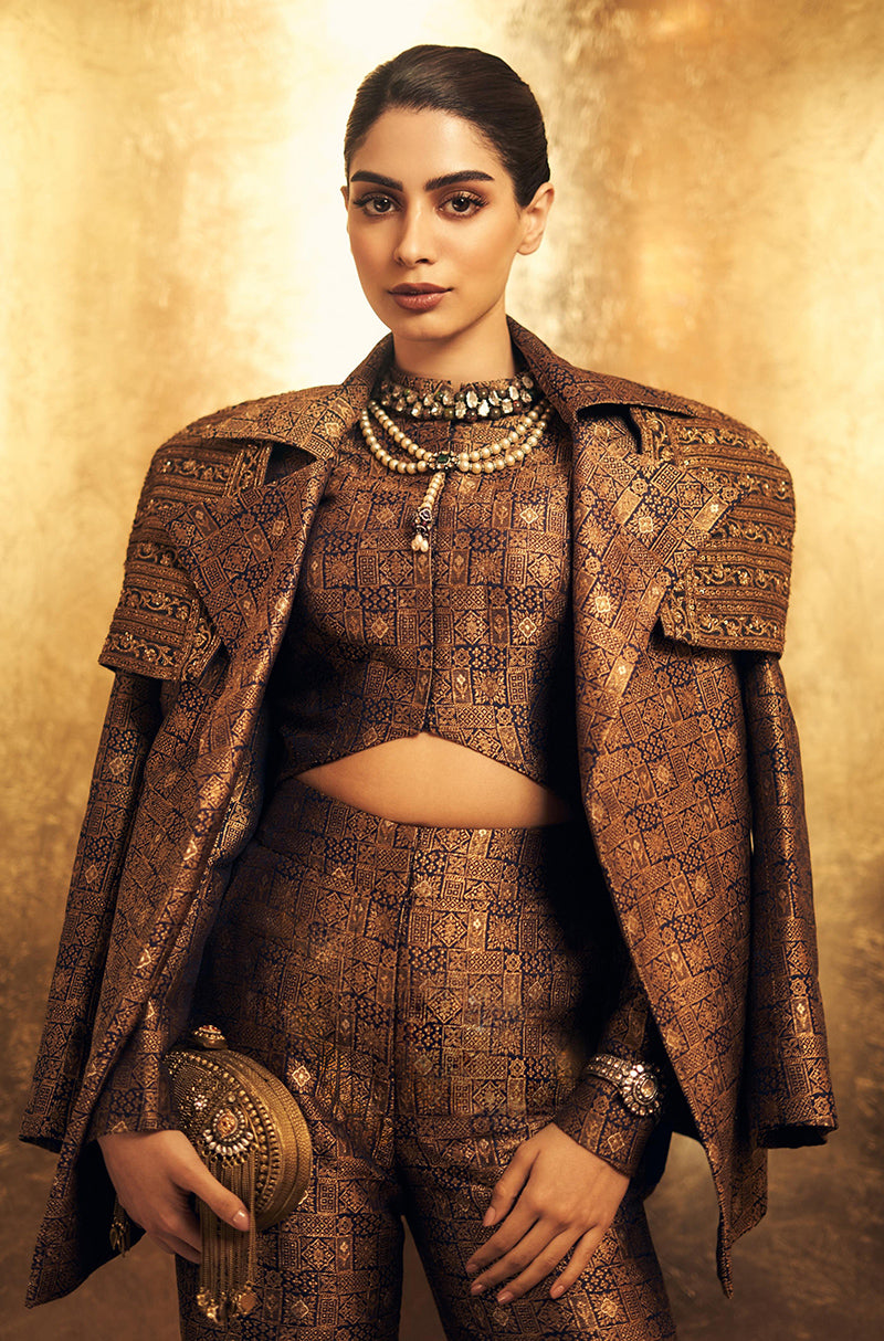 Khushi Kapoor in our brown brocade shirt. Paired with a matching jacket & flared pants.