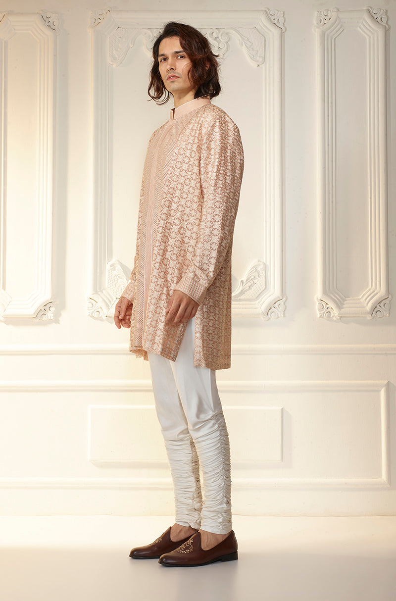 Latte threadwork embroidered kurta paired with churidar.