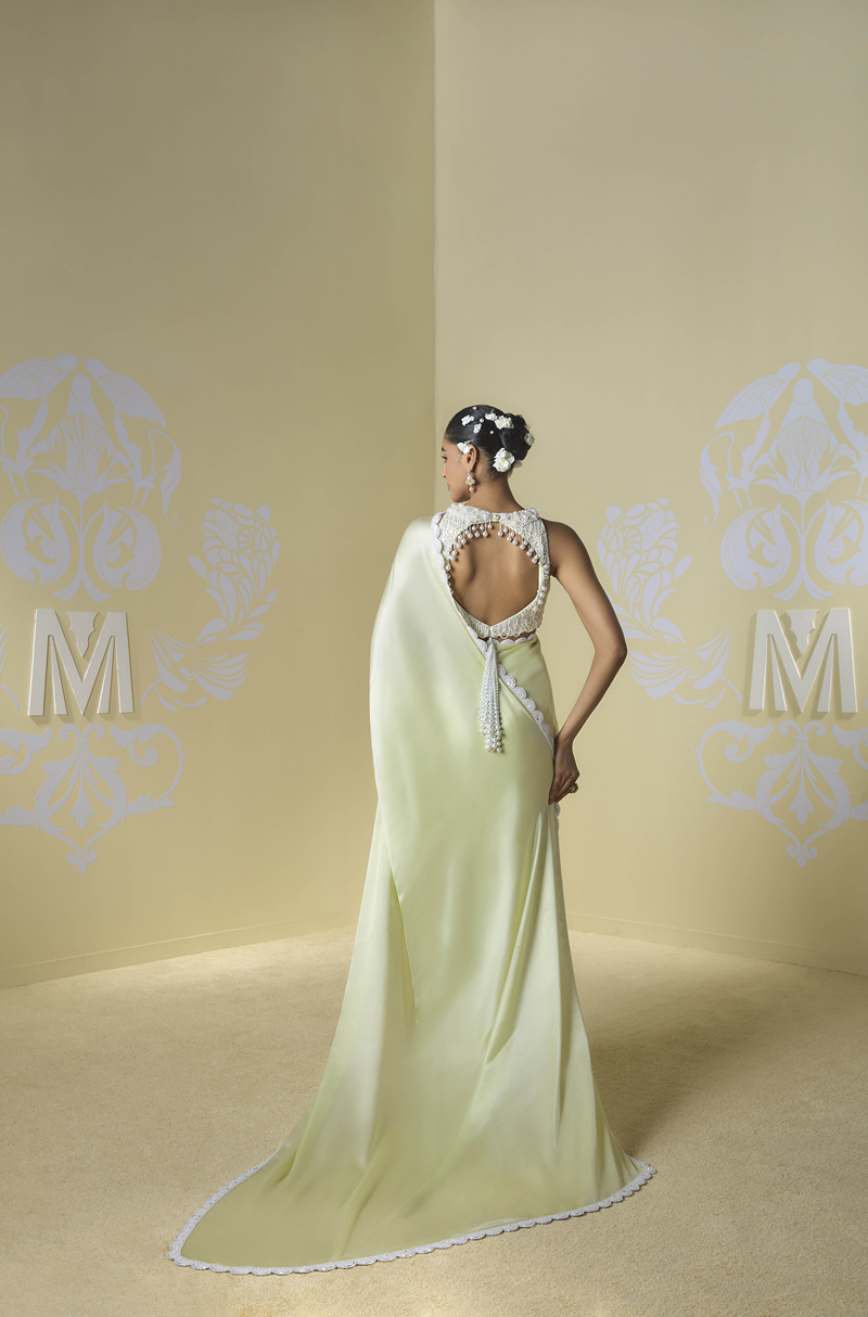 Light green satin saree with pearl scallop border, paired with a pearl embroidered blouse and inskirt.