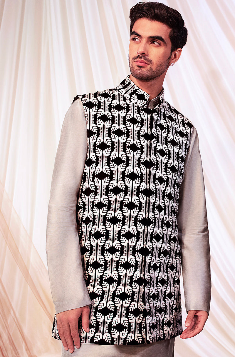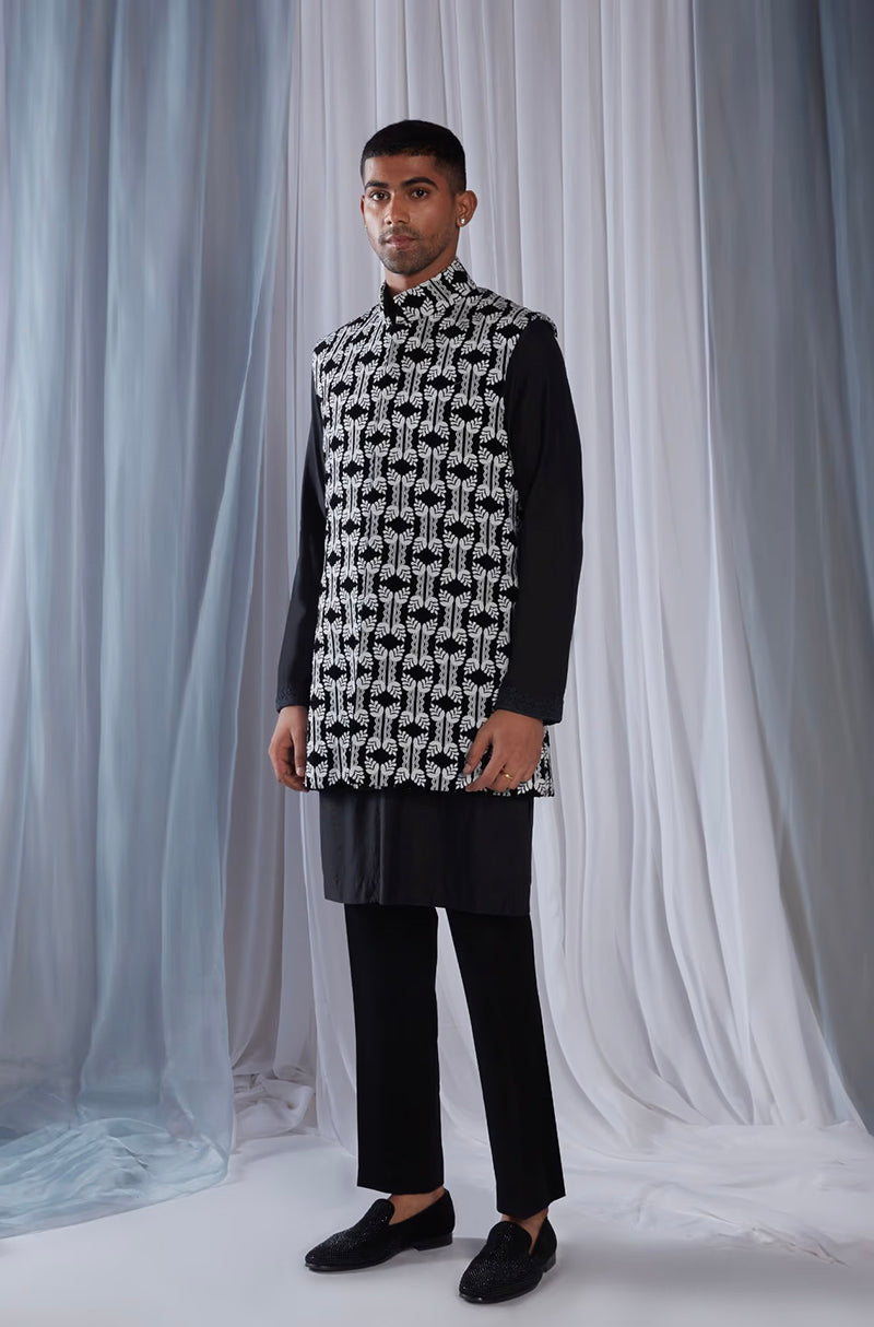 Mijwan black thread embroidered bundi. Paired with matching kurta & pants.