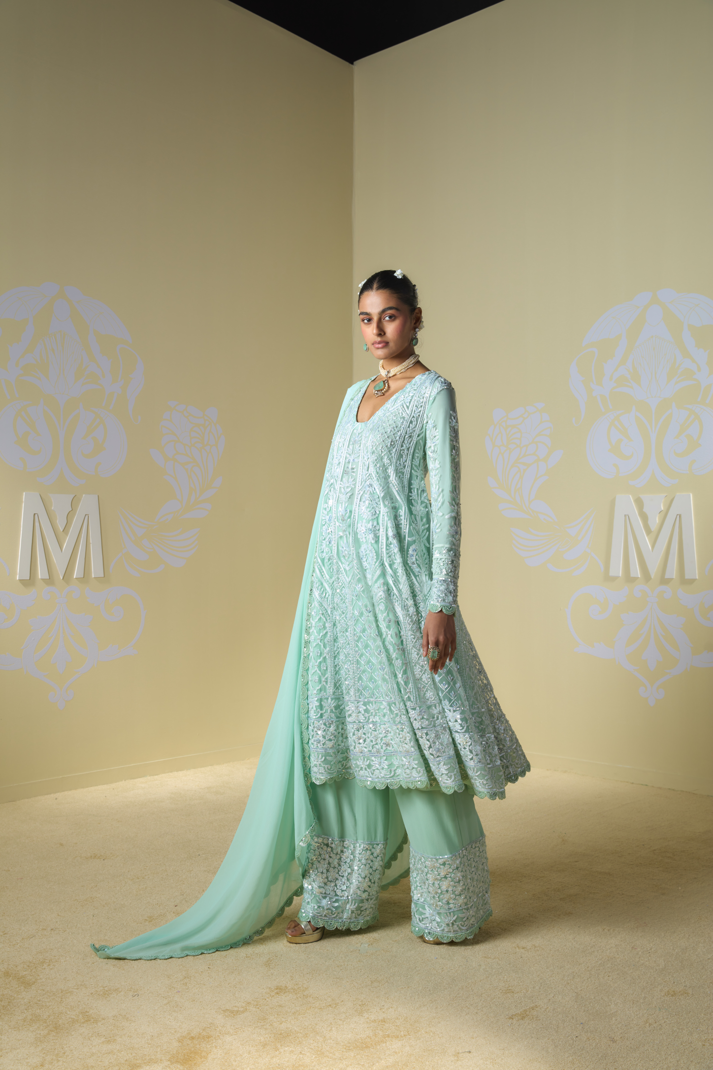 Mint kashmiri self highlighted kurta. Paired with matching slim pallazos and dupatta.