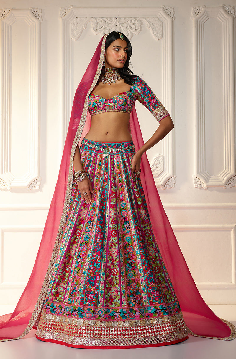 Multicolor kashmiri embroidery patched lehenga. Paired with a matching kashmiri embroidered blouse with back tassel and headveil.
