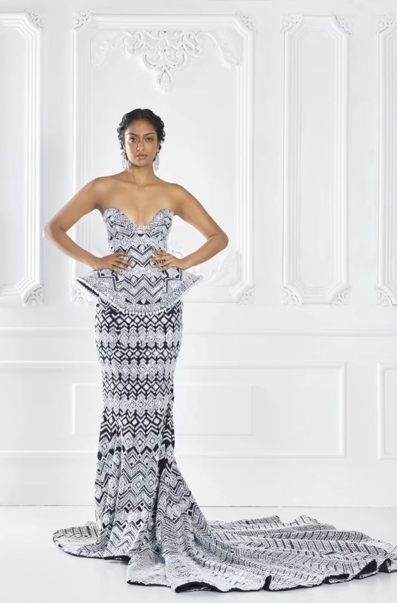 Capture the mood of opulence with this navy and ivory taban sequins peplum top. Paired with a matching fit-to-flare trailing skirt.Â