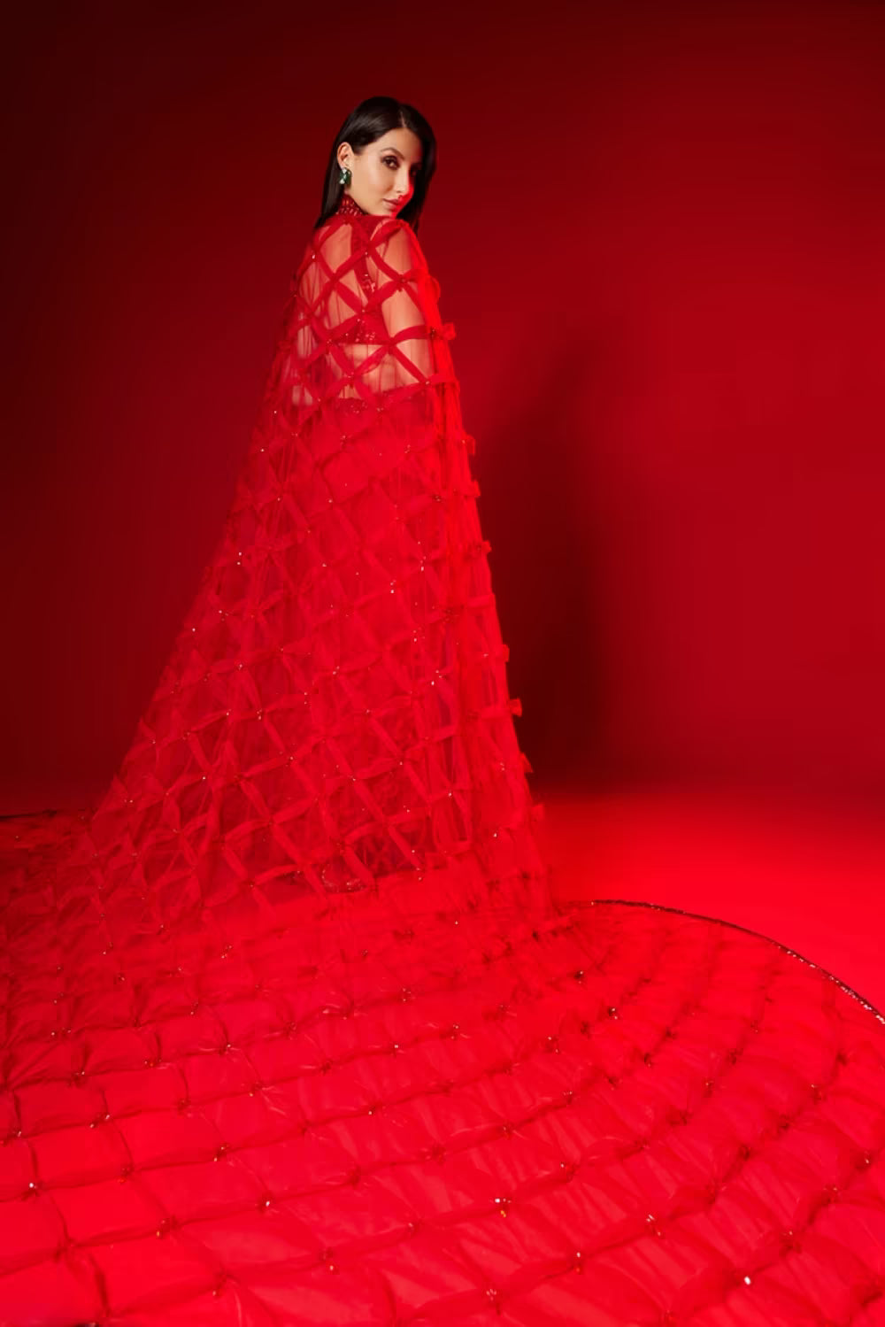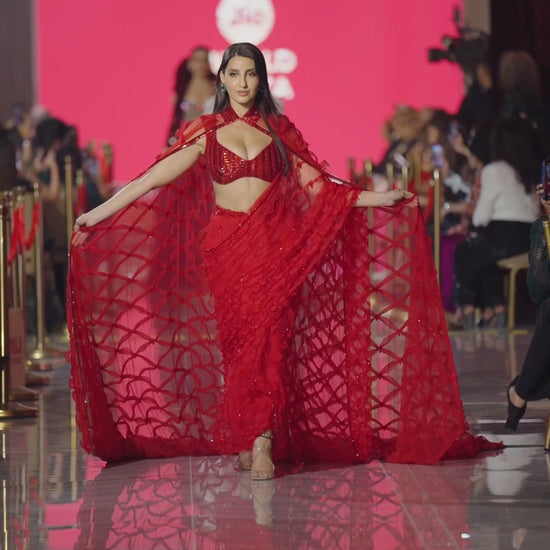 Nora Fatehi in our Red Saree and Cape Set