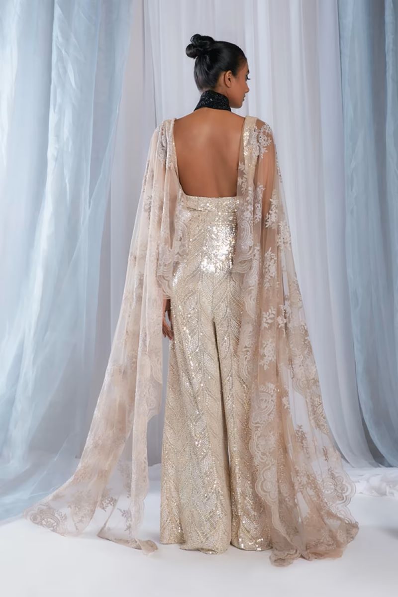 Oyster body suit with flare bottom & adorned with leaf embroidery & sequins. Paired with a lace drape with tonal embroidery.
