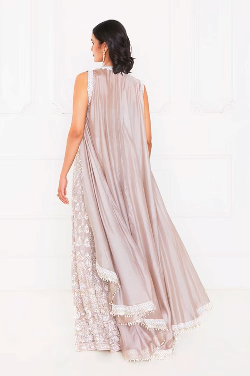 Oyster base with ivory threadwork sharara, highlighted with gold, silver bugle beads & pearls. Paired with an embroidered corset & silk organza cape with border.