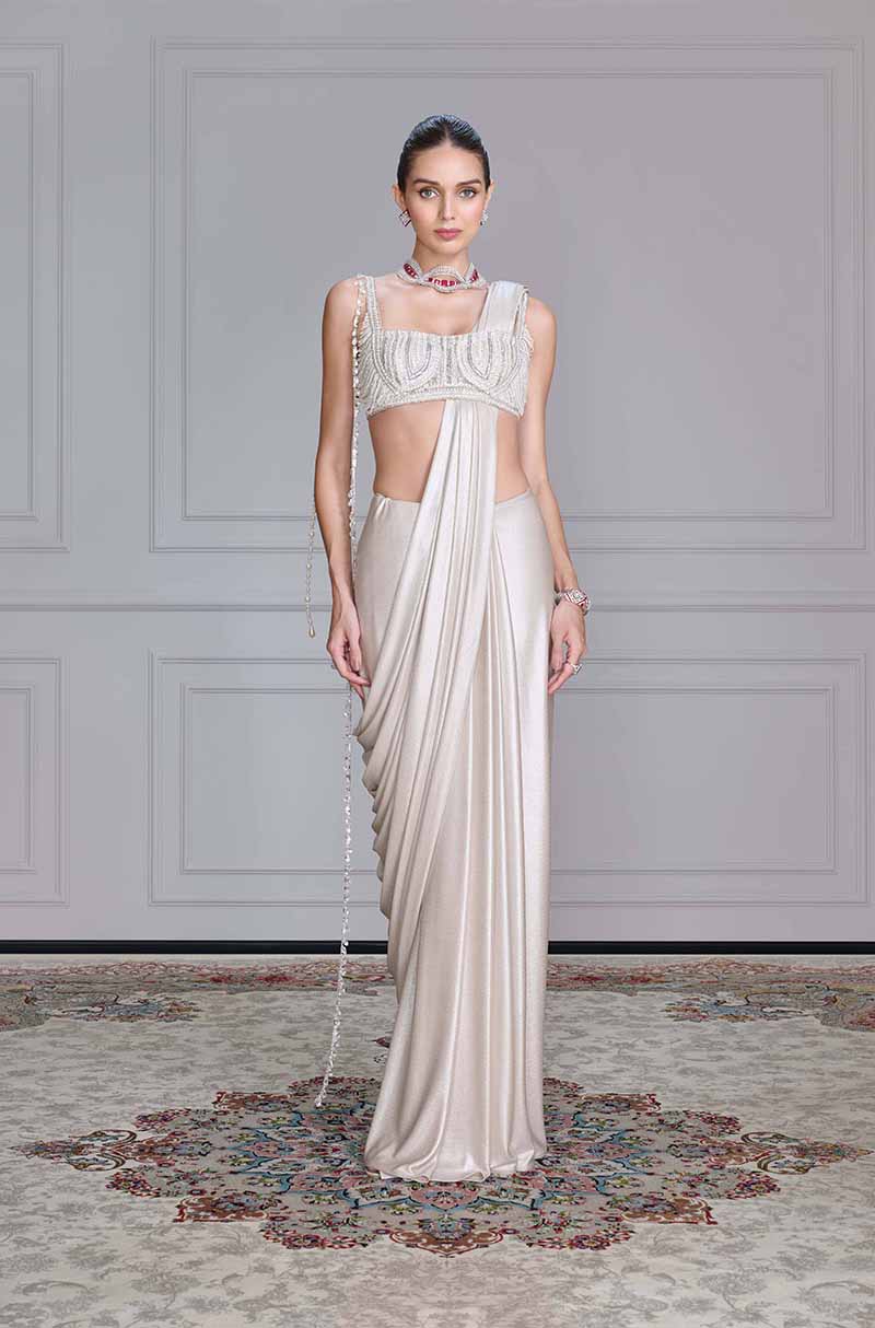 Oyster textured saree, paired with a grey embroidered blouse. Comes with MM crystal drapes & inskirt.