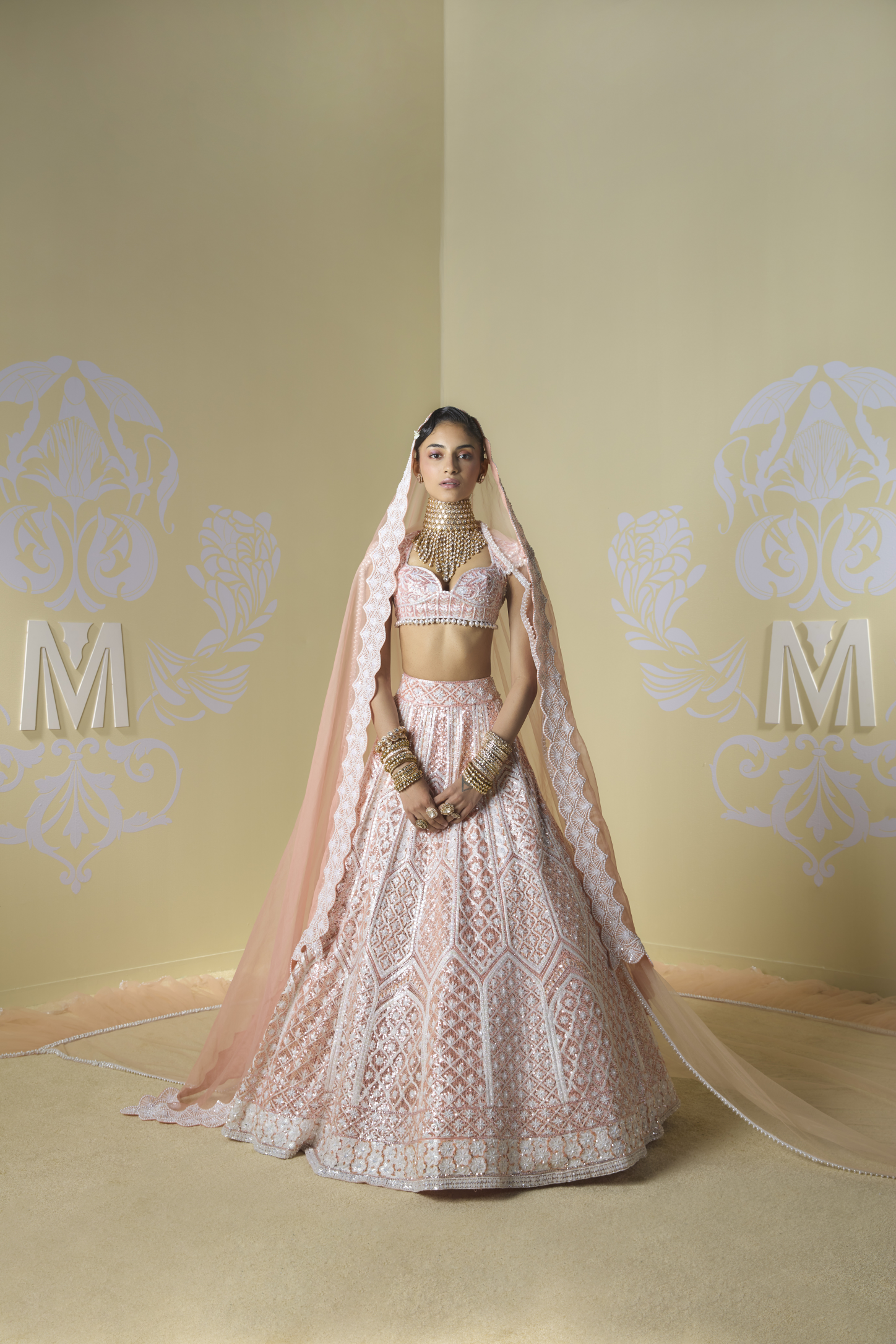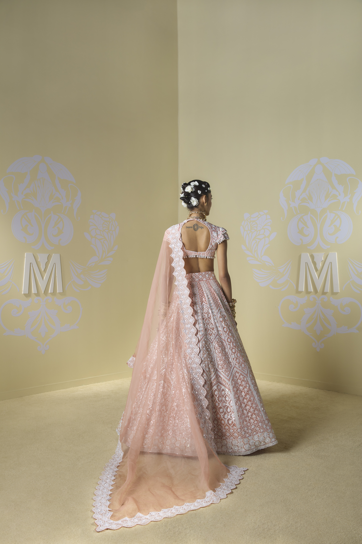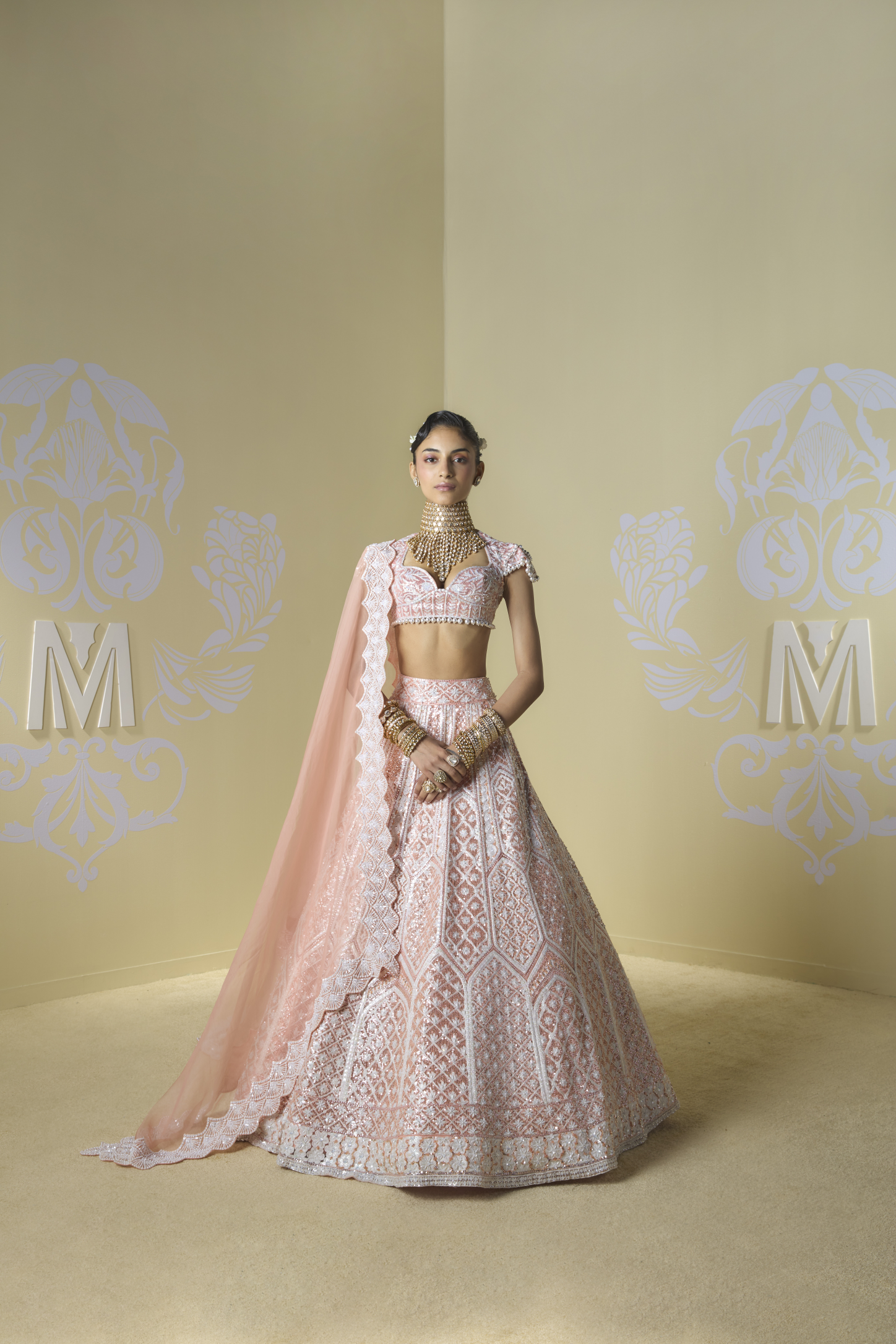 Peach and Ivory Geometric Embroidered Lehenga Set