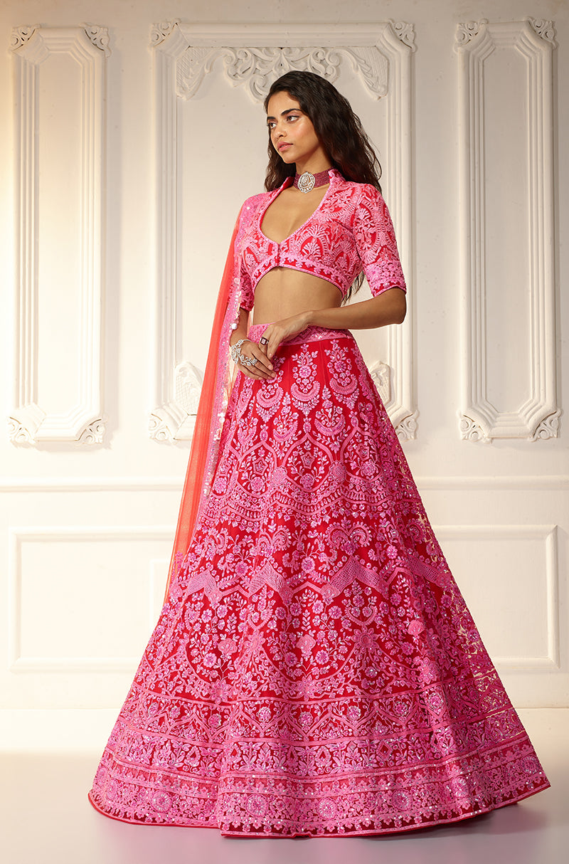 Red with pink chikankari Mijwan embroidered lehenga. Paired with a matching embroidered blouse & dupatta.