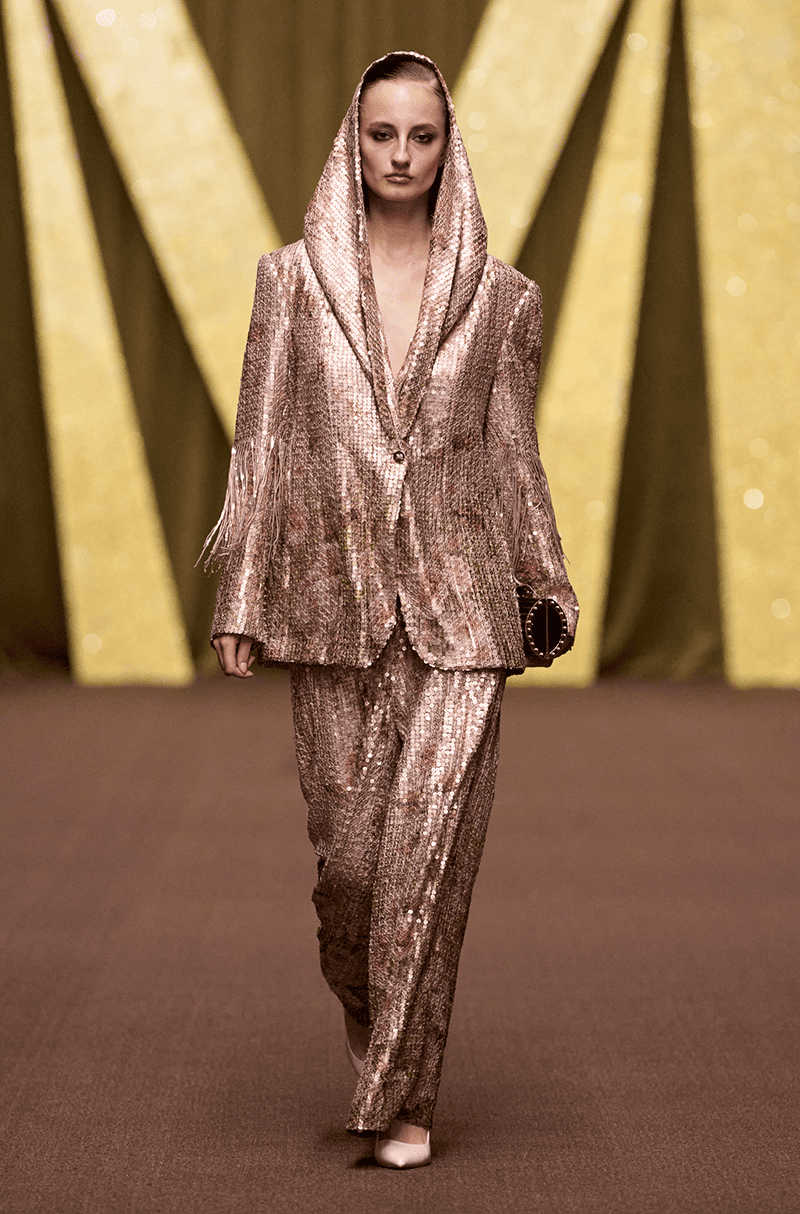 Rose gold floral printed sheeted blazer set with elongated hood attached to the collar with tassels on the sleeves.