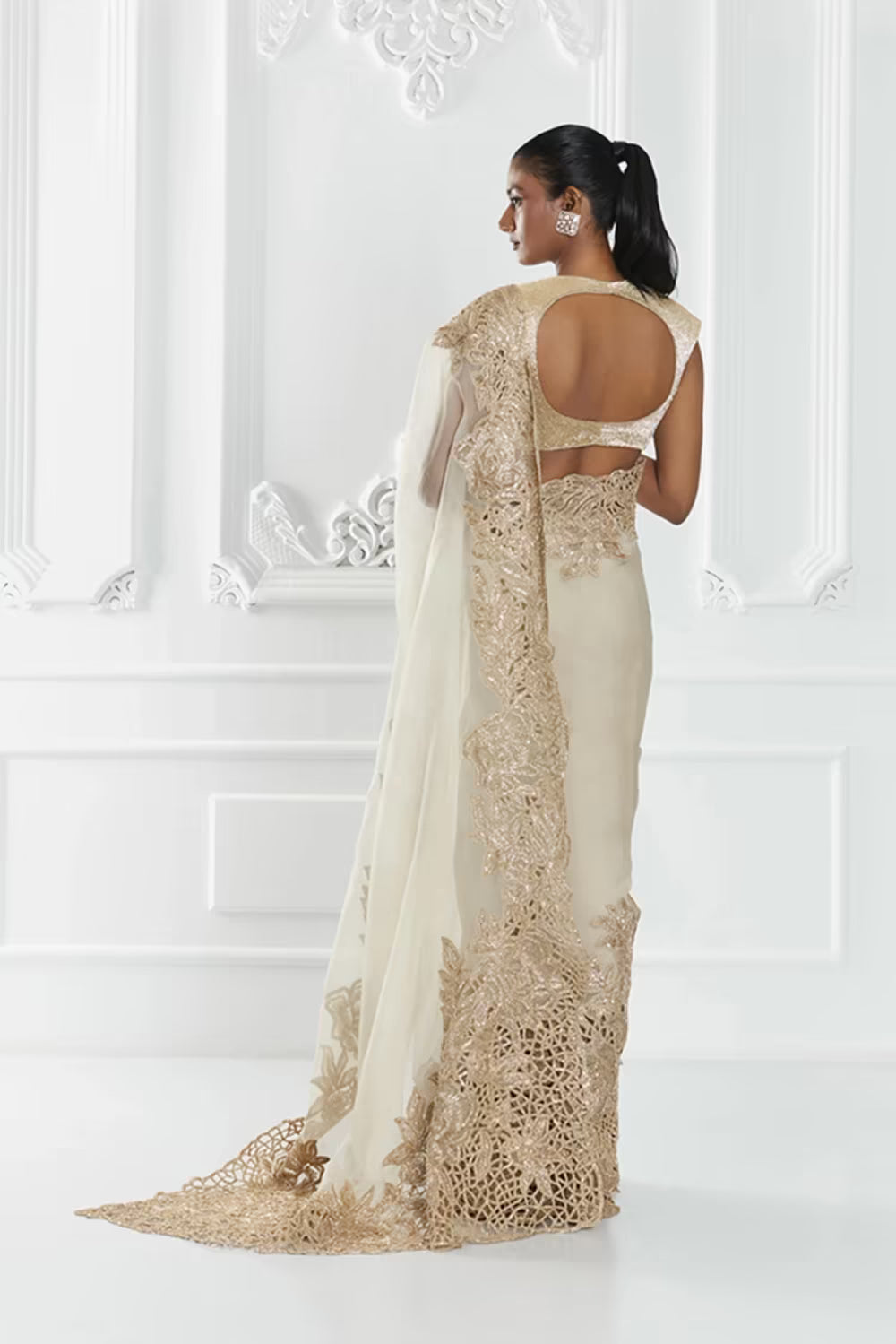 Sage green saree highlighted with exquisite gold embroidery and cutwork detailing. Paired with a matching blouse.
