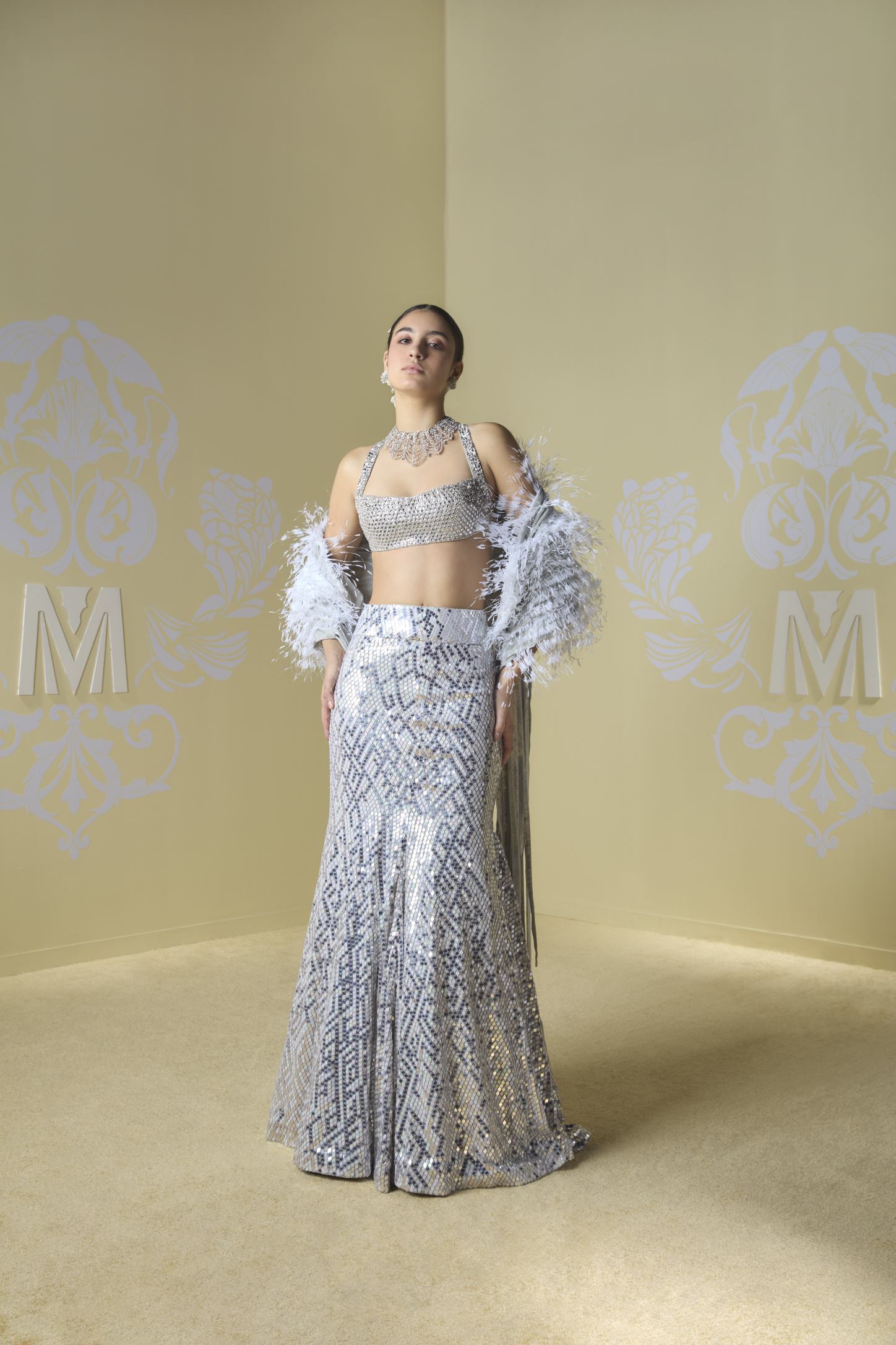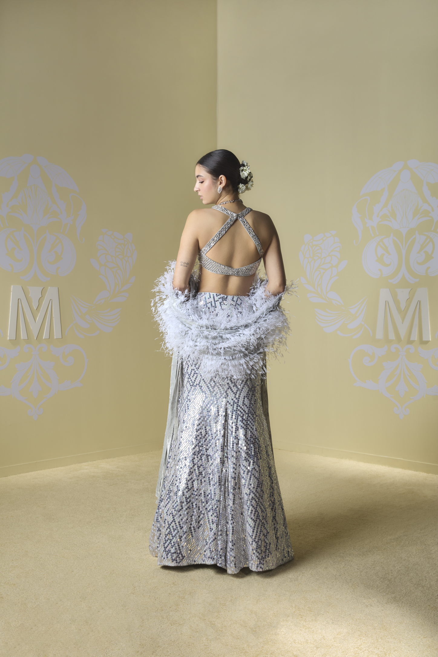 Ivory and silver diamond sequins embroidered fishtail lehenga. Paired with a stone encrusted blouse and a feather stole.