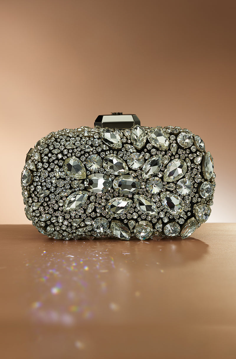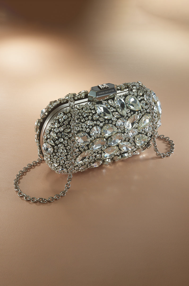 Where radiance becomes a signature. A silver-toned clutch defined by intricate mixed stone embroidery and refined palladium plated hardware. Featuring a sculpted hexagonal Manish Malhotra lift-lock and sling chain, it captures depth, luminosity, and understated sophistication.