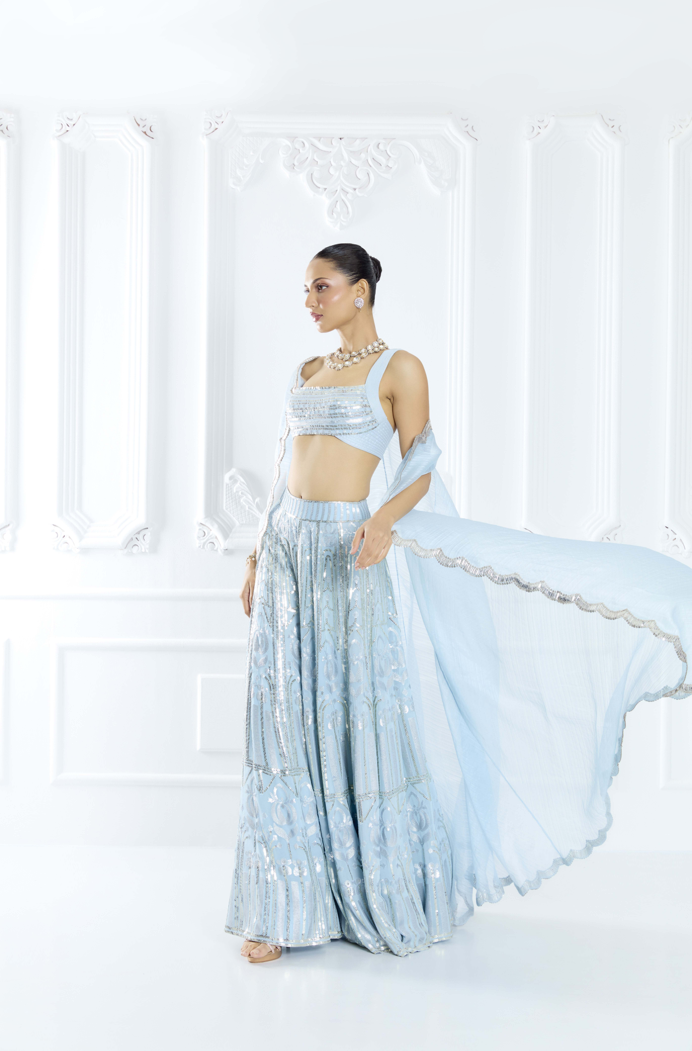 Sky blue georgette embroidered sharara set. Paired with a matching blouse and organza cape.