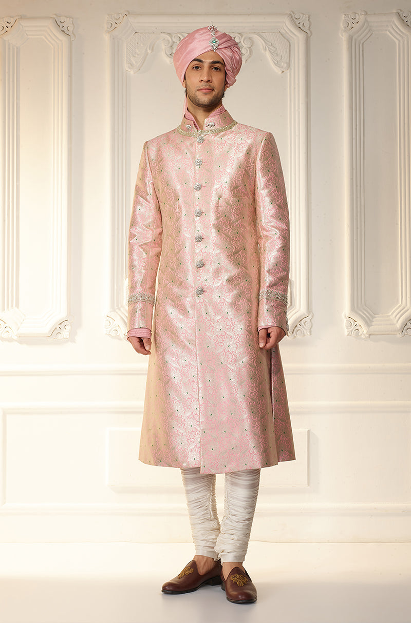 Soft pink brocade achkan sherwani with highlights at cuff & collar. Paired with plain kurta & churidar.