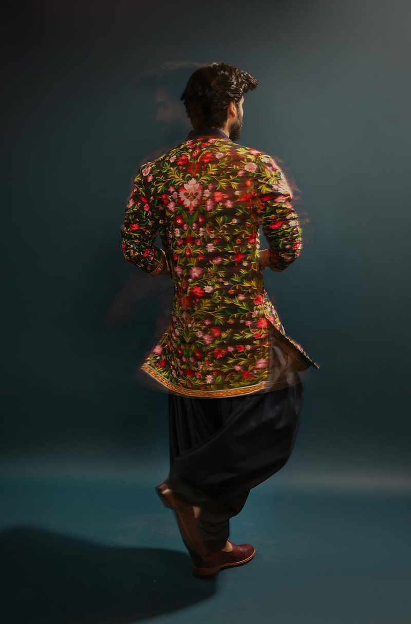 Sunny kaushal in our Navy Blue with multicoloured floral thread embroidered kurta paired with a navy salwar.