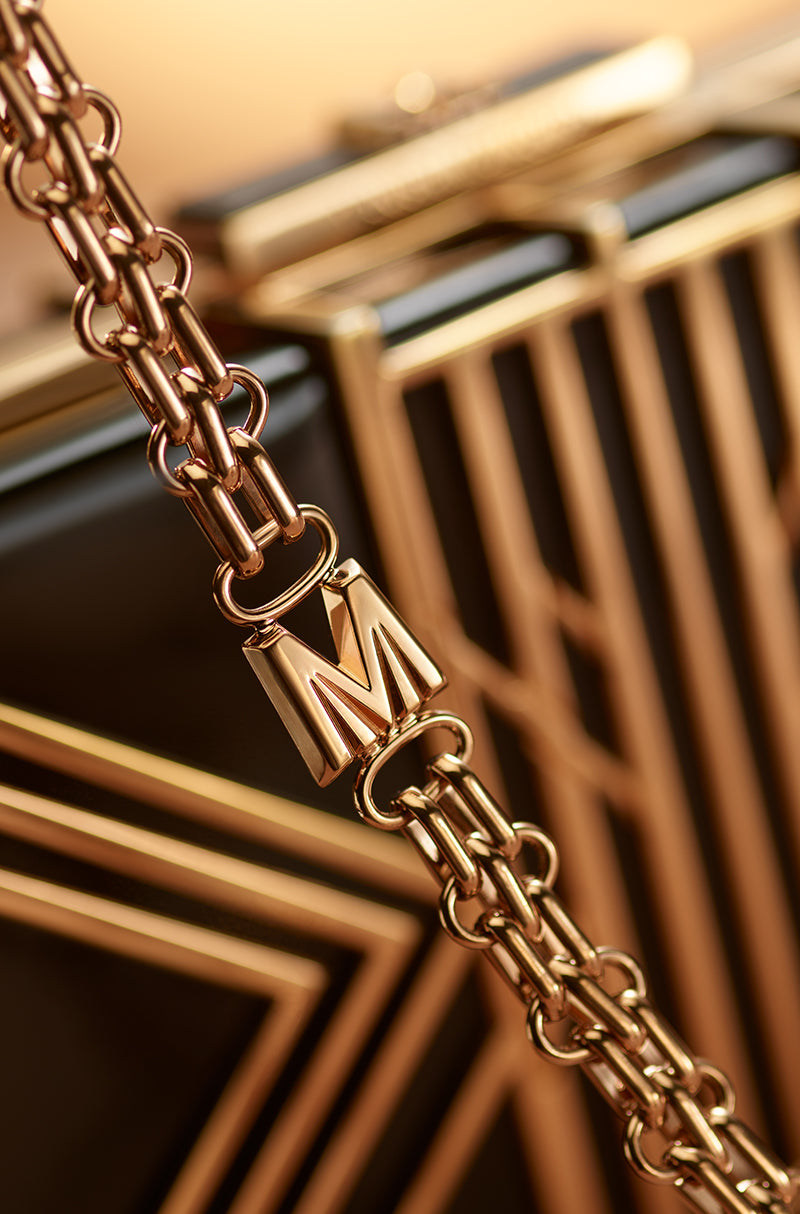 And in her arms, she holds the city. A sleek black patent leather clutch with a high-gloss finish and gold-tone detailing. Completed with a rectangular Manish Malhotra push-lock and a statement mesh chain, it expresses timeless glamour through a contemporary lens.