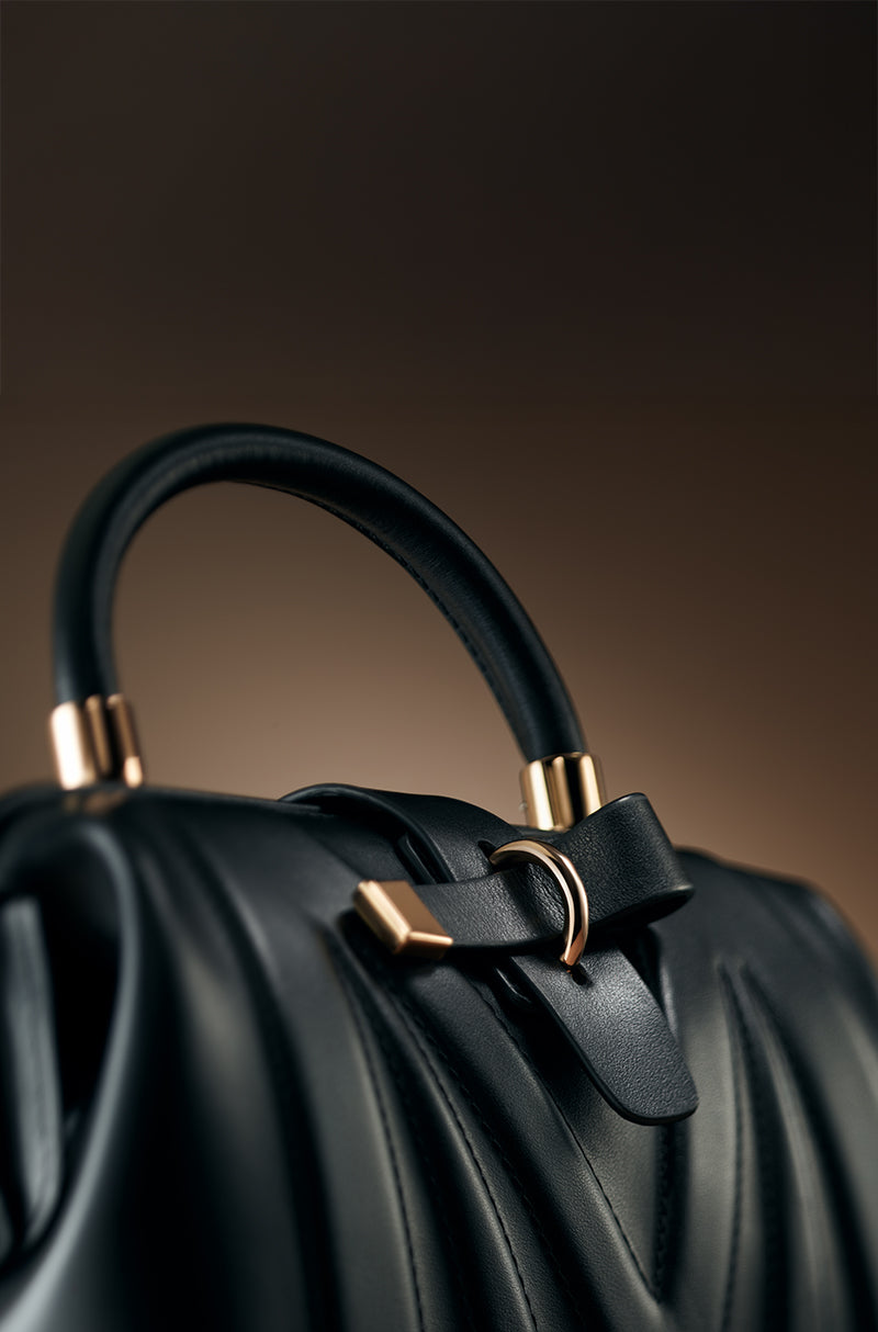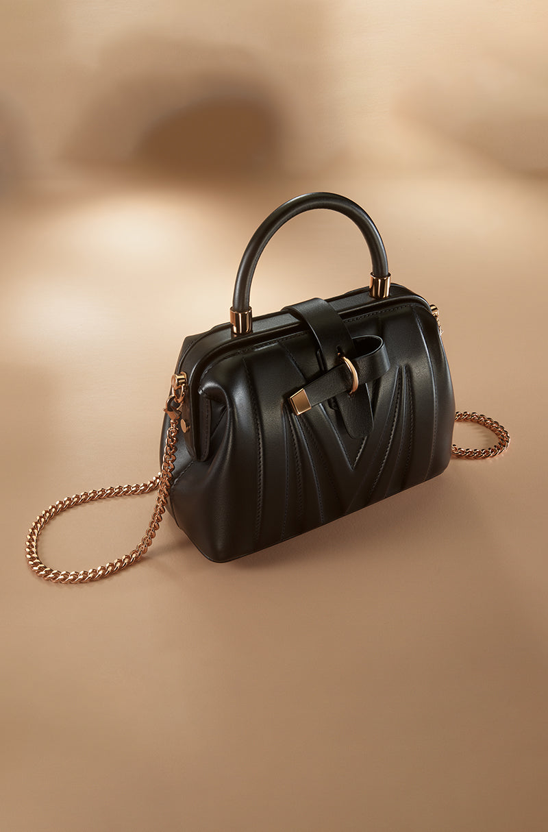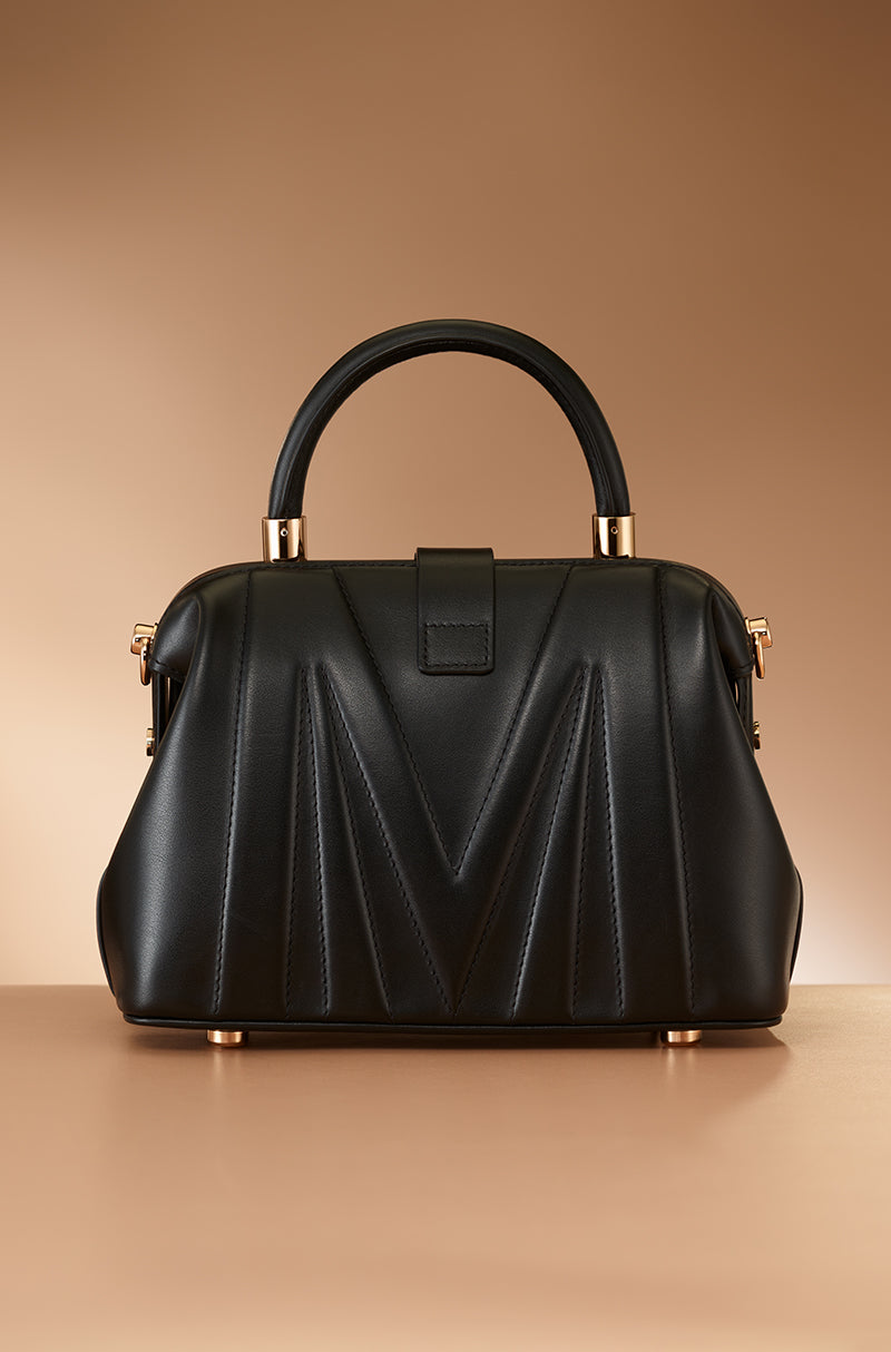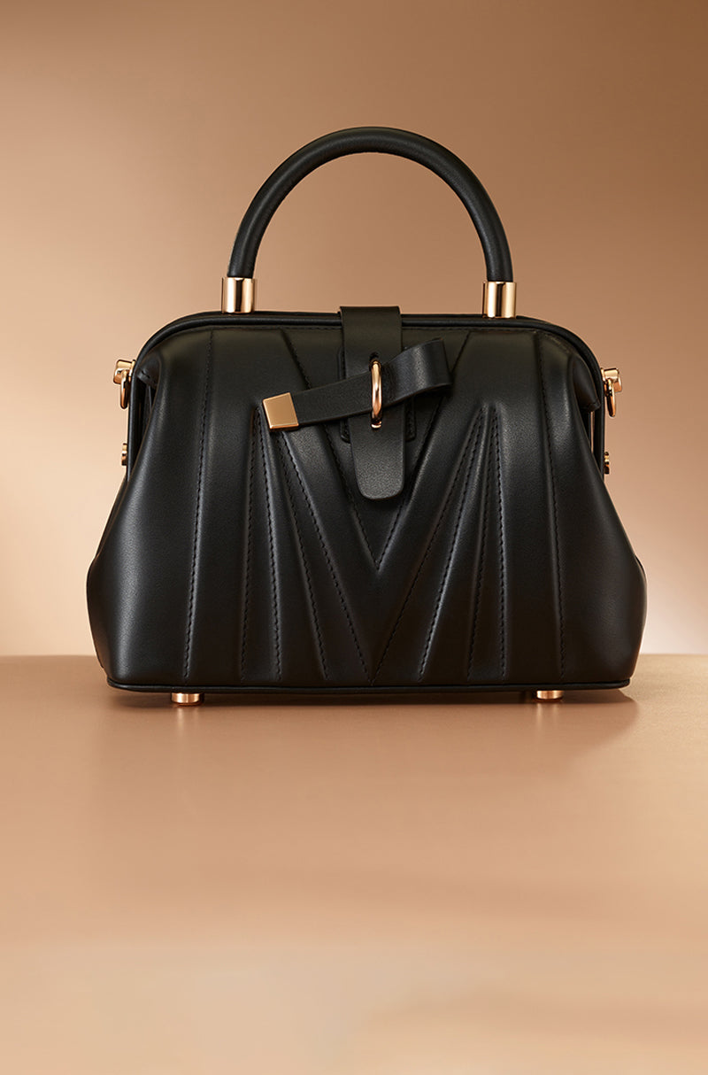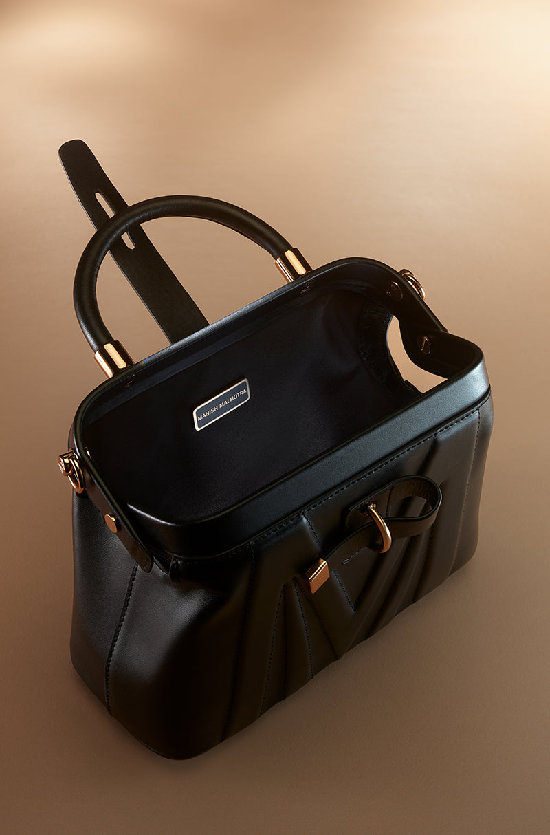 Inspired by the rhythm of the city. A black leather top-handle bag framed with polished rose gold hardware and base studs. Featuring a signature Manish Malhotra frame opening, poly satin lining, and a detachable sling chain, it blends classic form with modern functionality.