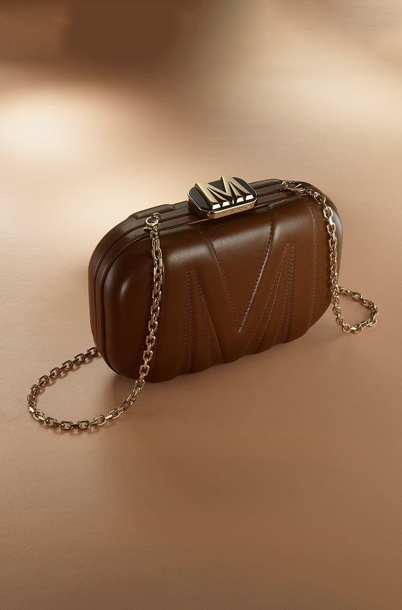 - Outer: Rounded rectangle in brown genuine leather with MM monogram embossed.
