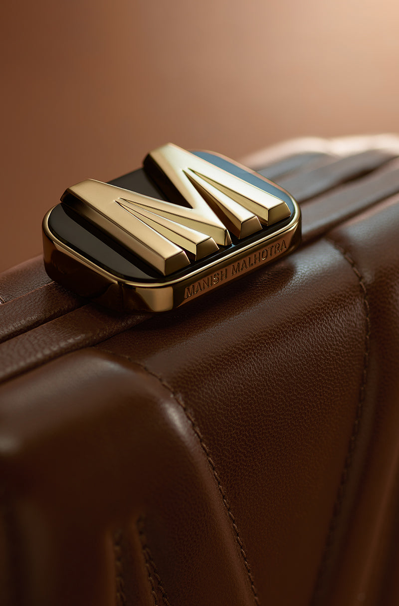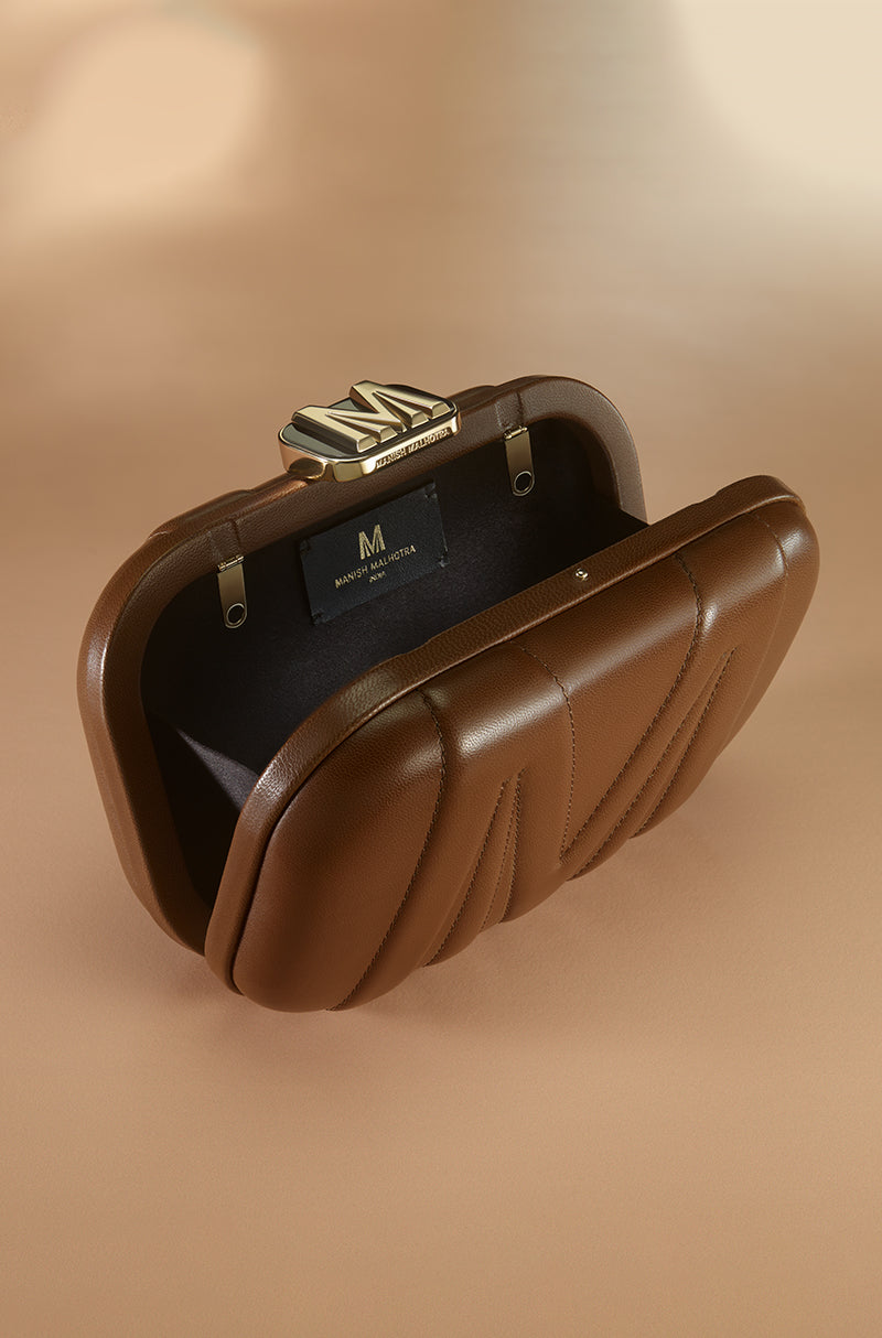 Unmistakably Manish. A refined clutch crafted in warm brown leather, featuring an embossed Manish Malhotra monogram on a softly structured rounded-rectangle silhouette. Finished with light gold hardware and a signature trapezoid lift-lock, it embodies understated elegance.