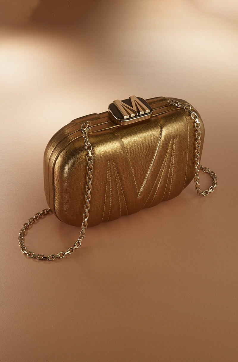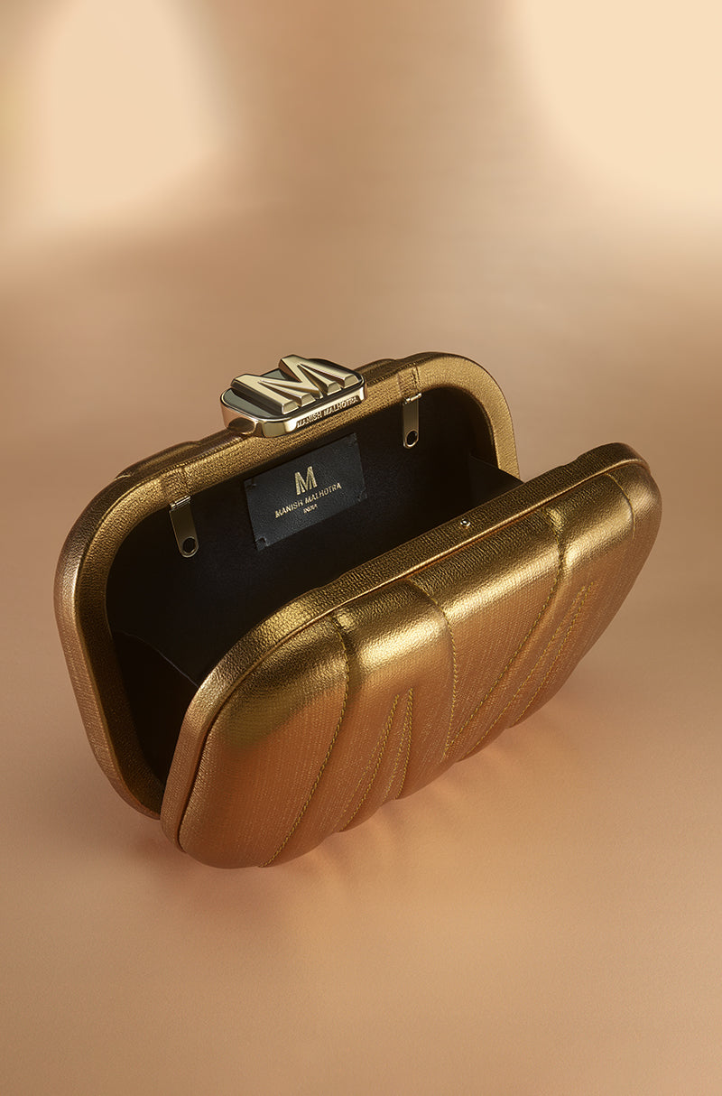 Unmistakably Manish. A contemporary clutch in metallic bronze leather, detailed with an embossed Manish Malhotra monogram on a sleek rounded-rectangle form. Finished with light gold accents and a signature trapezoid lift-lock, it lends a subtle glow to festive and evening looks.