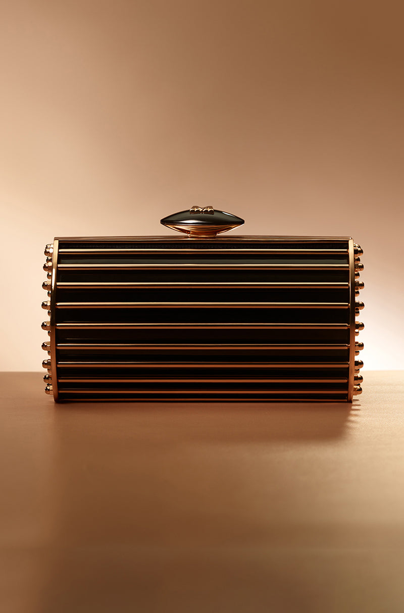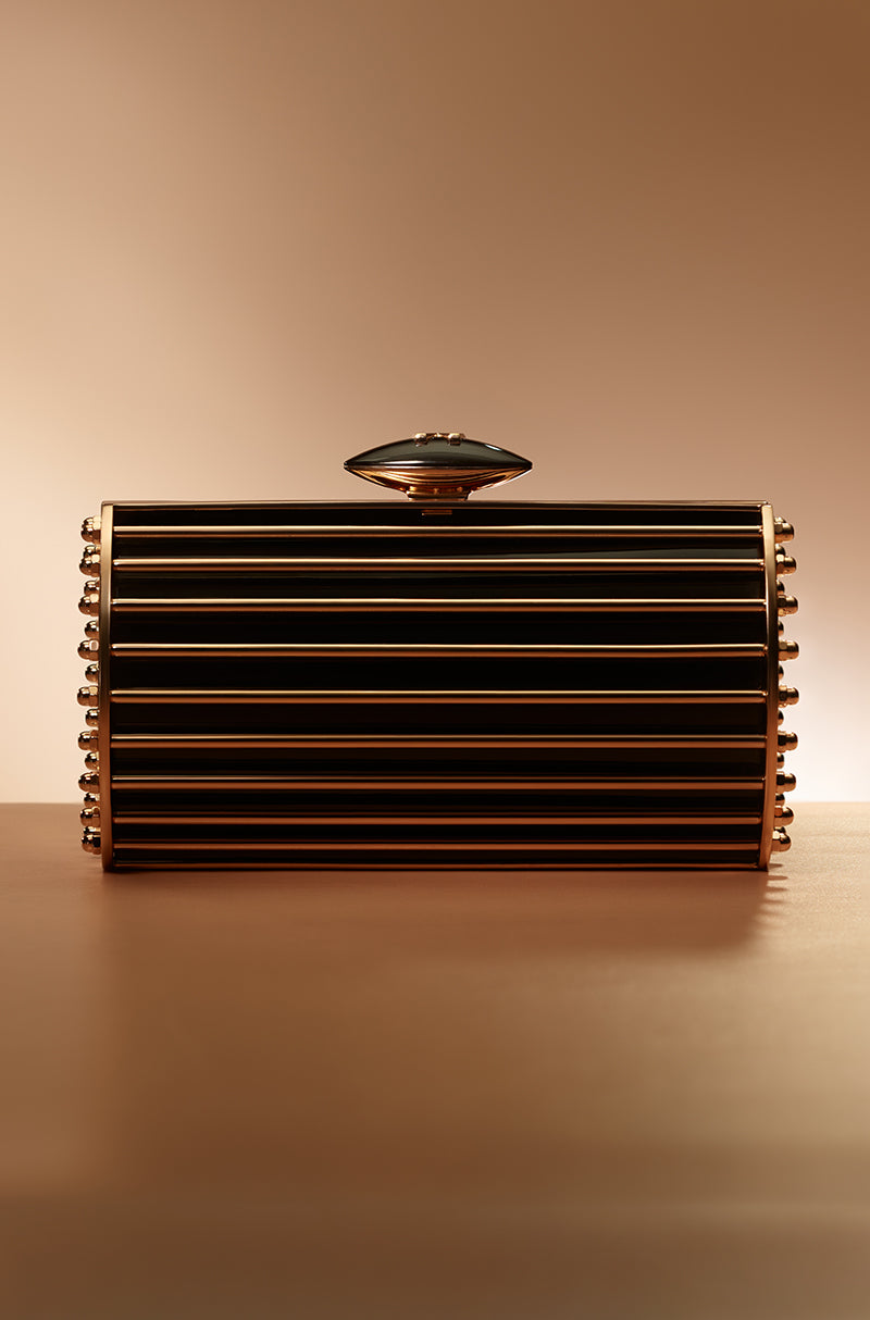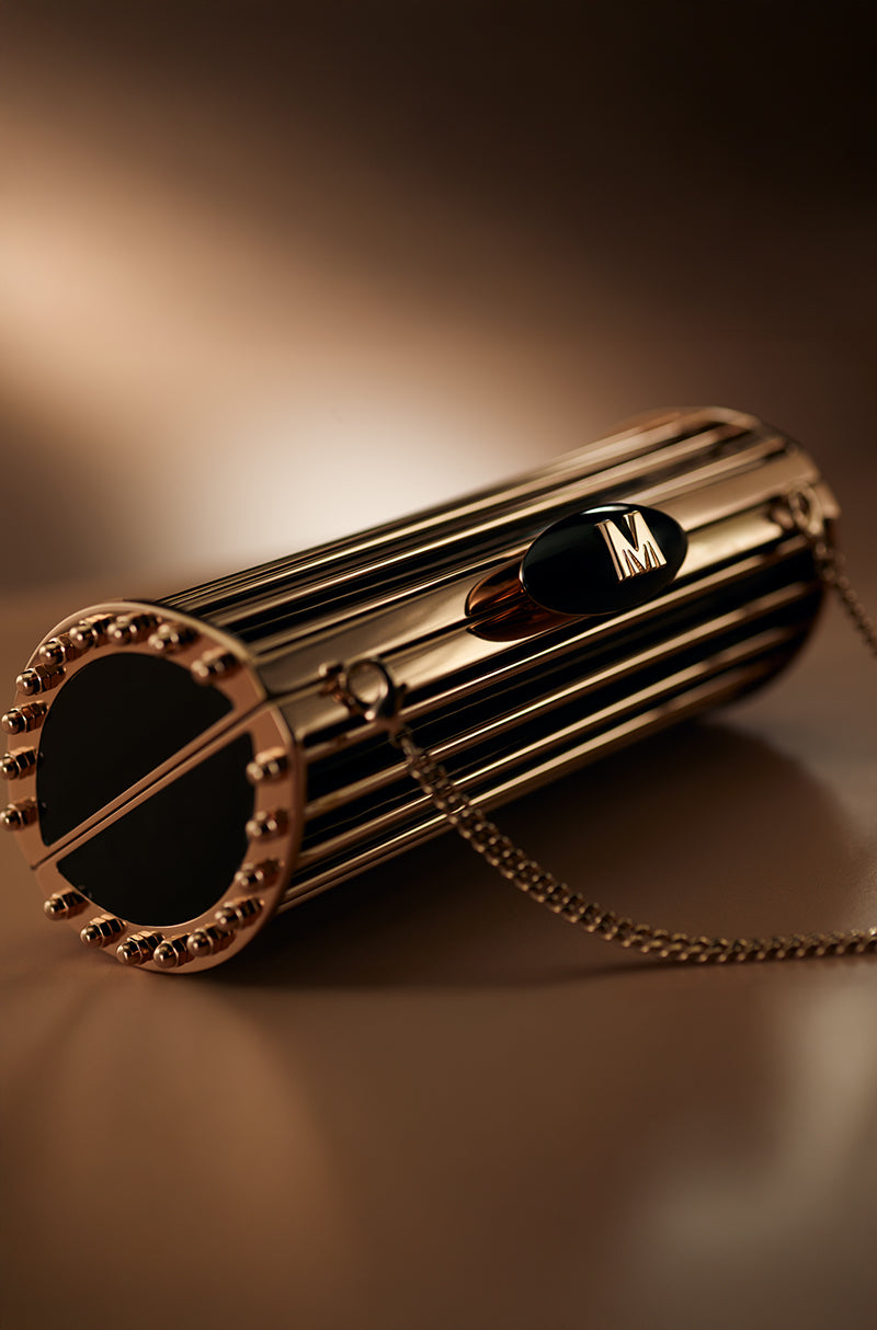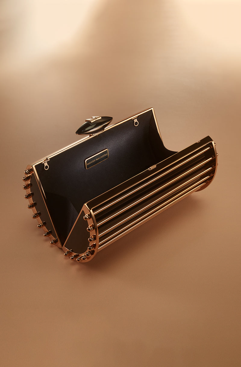 Ready for glam, glitz and more. A striking cylindrical clutch crafted from a rose gold metal cage with a solid body, designed for a bold architectural presence. Finished with a Manish Malhotra oval lift-lock and a matching chain, it balances structure with fluid elegance.