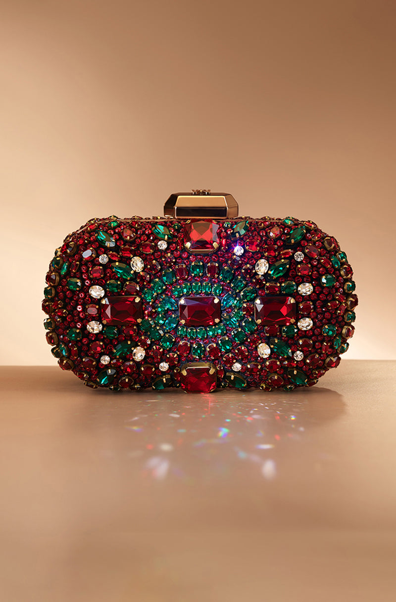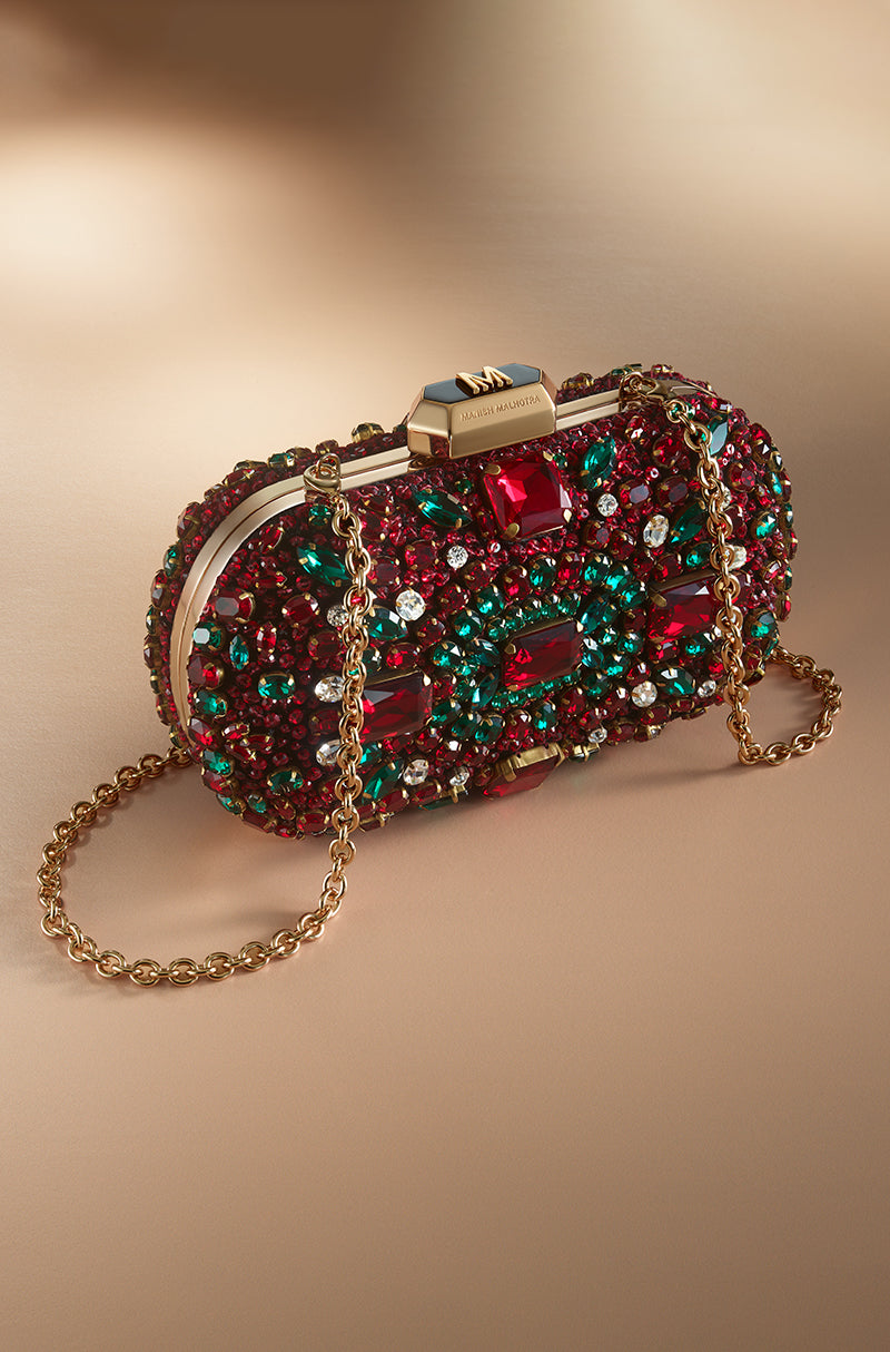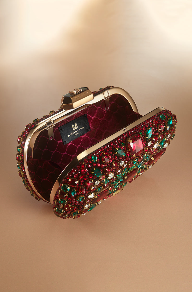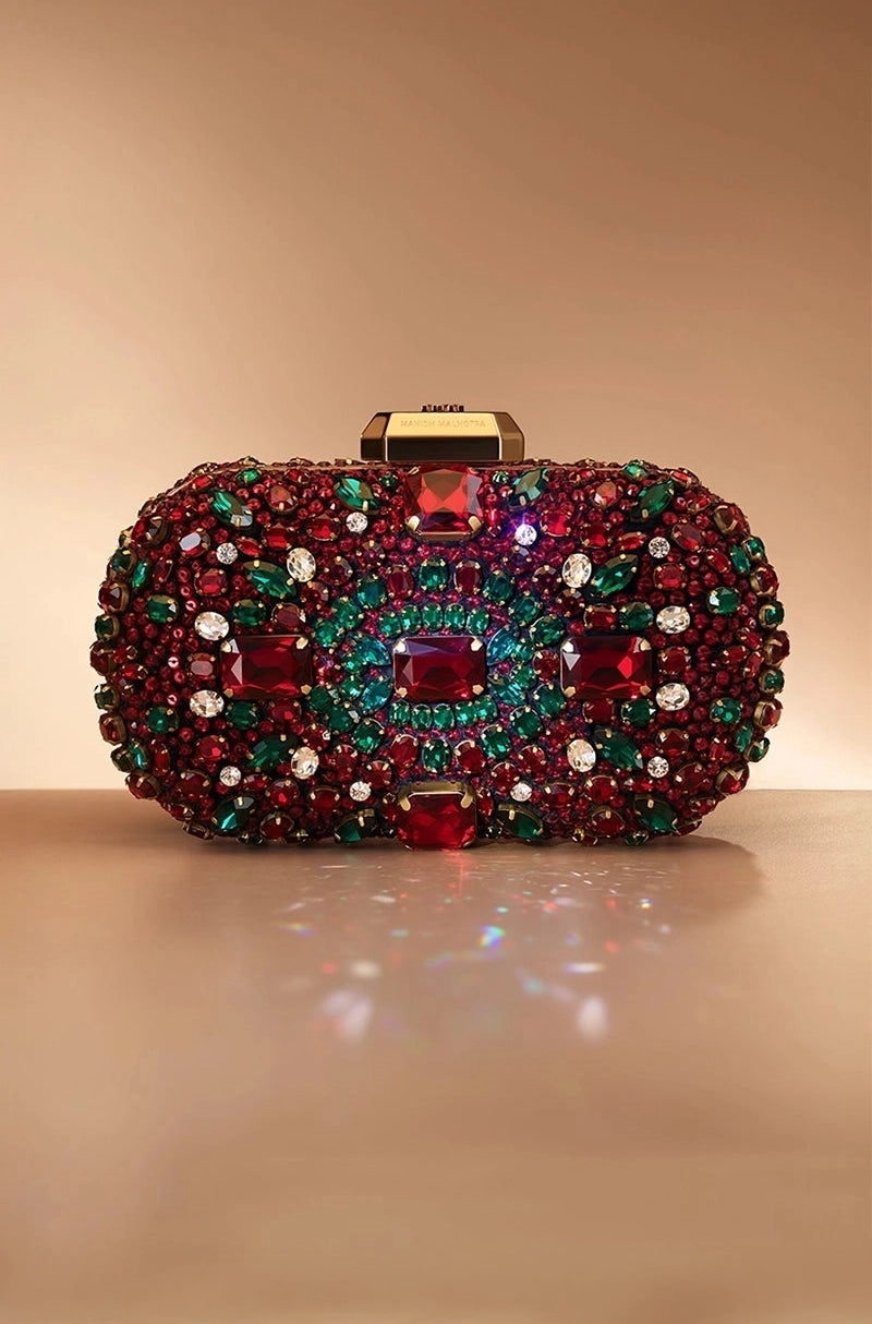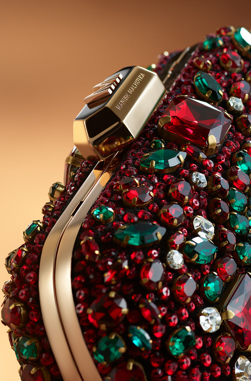 An evening clutch elevated through intricate mixed stone embroidery and a smooth satin interior. Finished with a signature Manish Malhotra monogram lift-lock fastening and a refined sling chain, it embodies the house’s couture sensibility and timeless glamour.